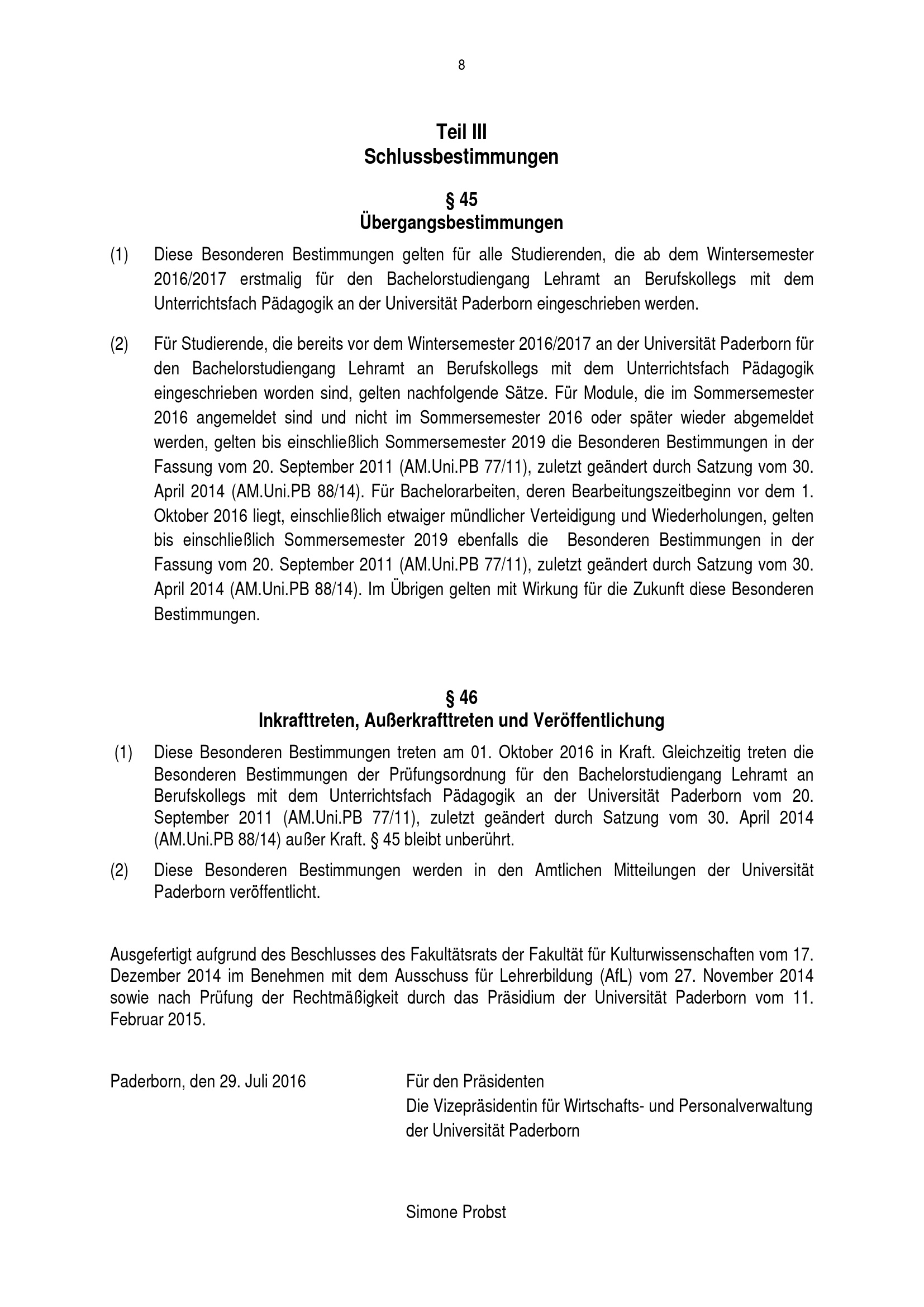 Besondere Bestimmungen der Prüfungsordnung für den Bachelorstudiengang Lehramt an Berufskollegs mit dem Unterrichtsfach Pädagogik an der Universität Paderborn : vom 29. Juli 2016