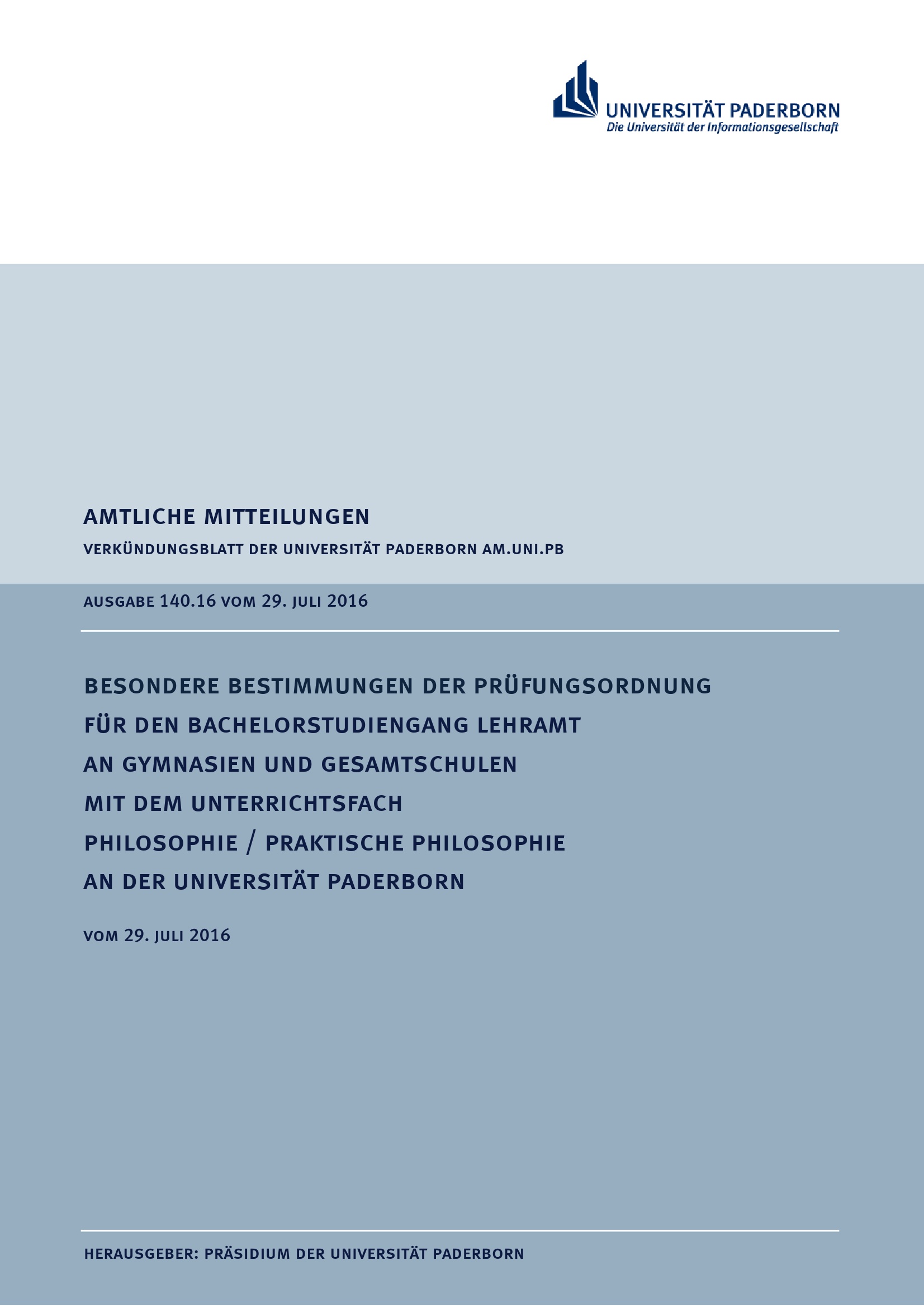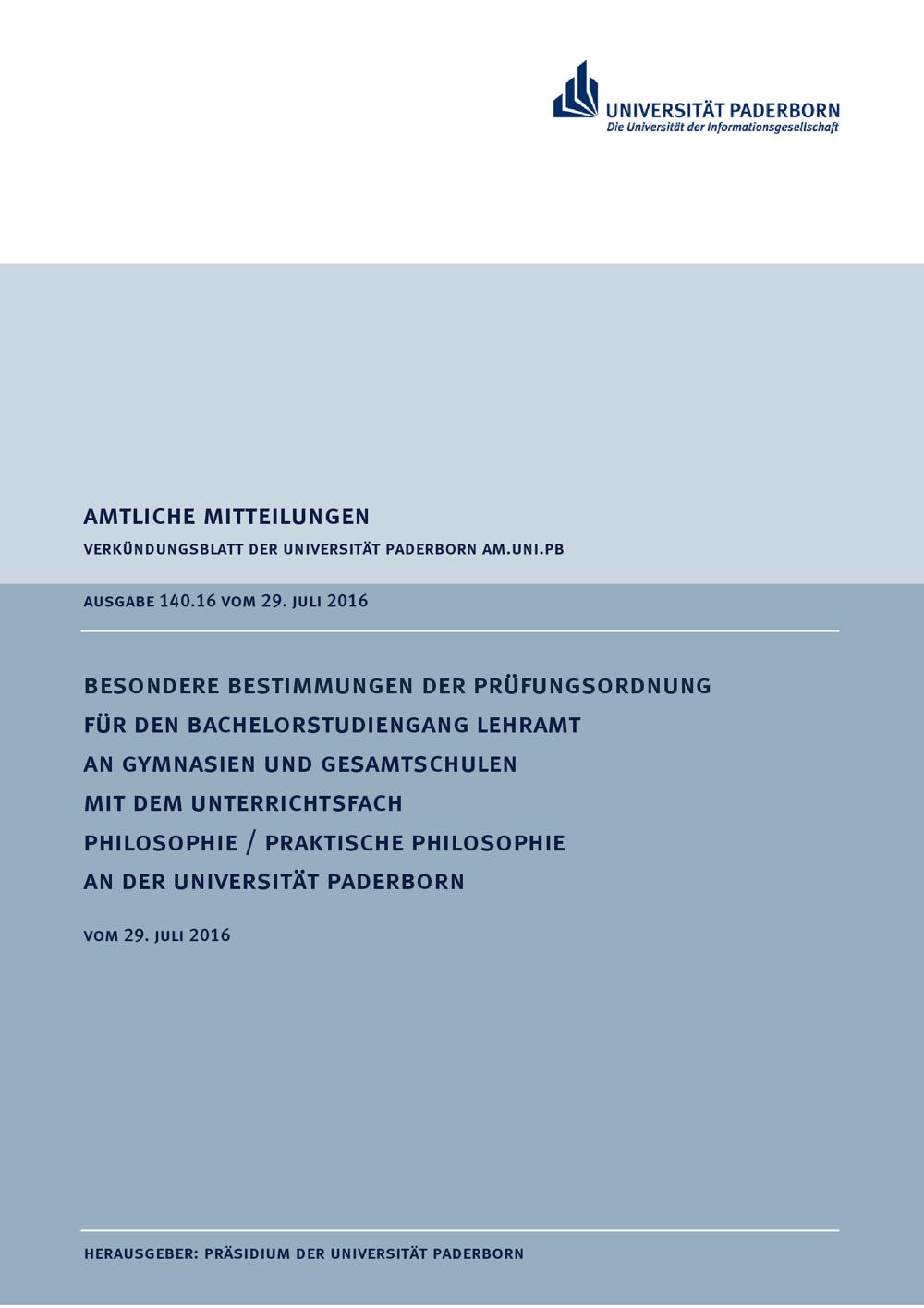 Besondere Bestimmungen der Prüfungsordnung für den Bachelorstudiengang Lehramt an Gymnasien und Gesamtschulen mit dem Unterrichtsfach Philosophie / Praktische Philosophie an der Universität Paderborn : vom 29. Juli 2016