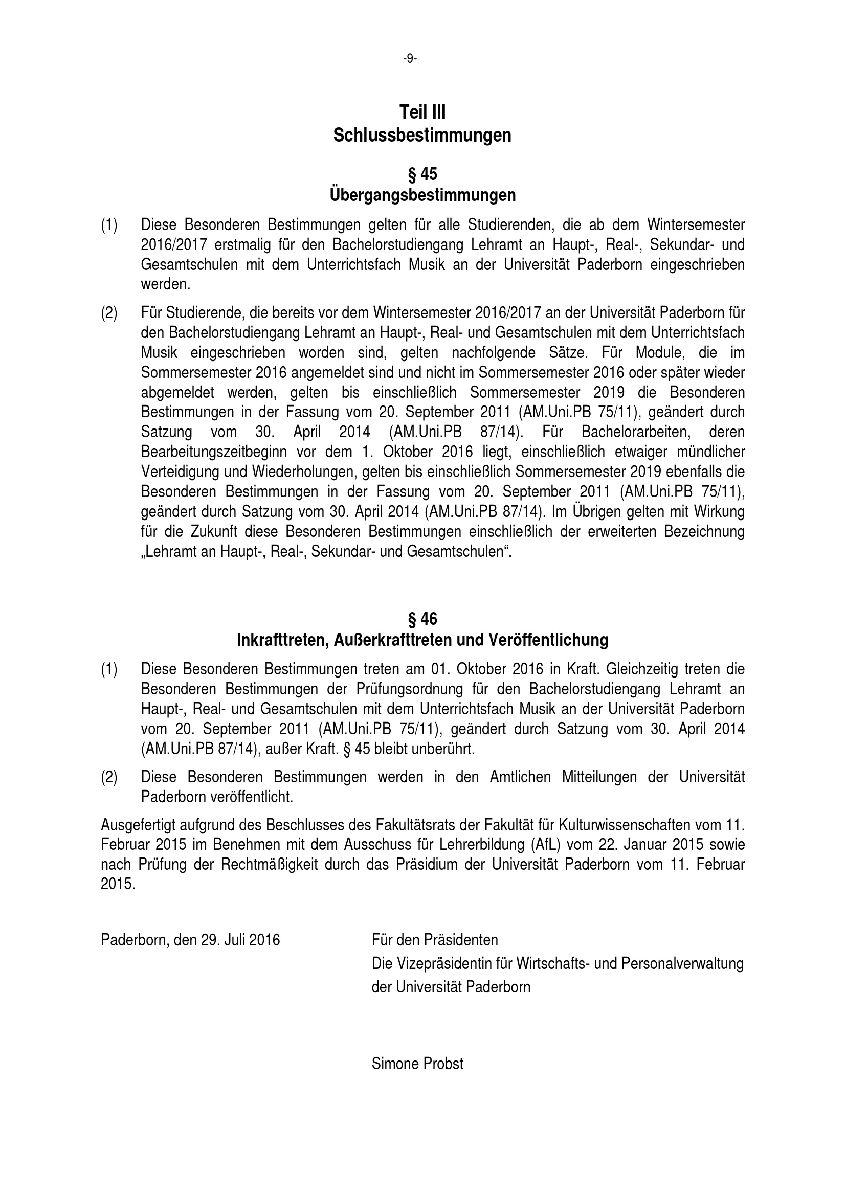Besondere Bestimmungen der Prüfungsordnung für den Bachelorstudiengang Lehramt an Haupt-, Real-, Sekundar- und Gesamtschulen mit dem Unterrichtsfach Musik an der Universität Paderborn : vom 29. Juli 2016