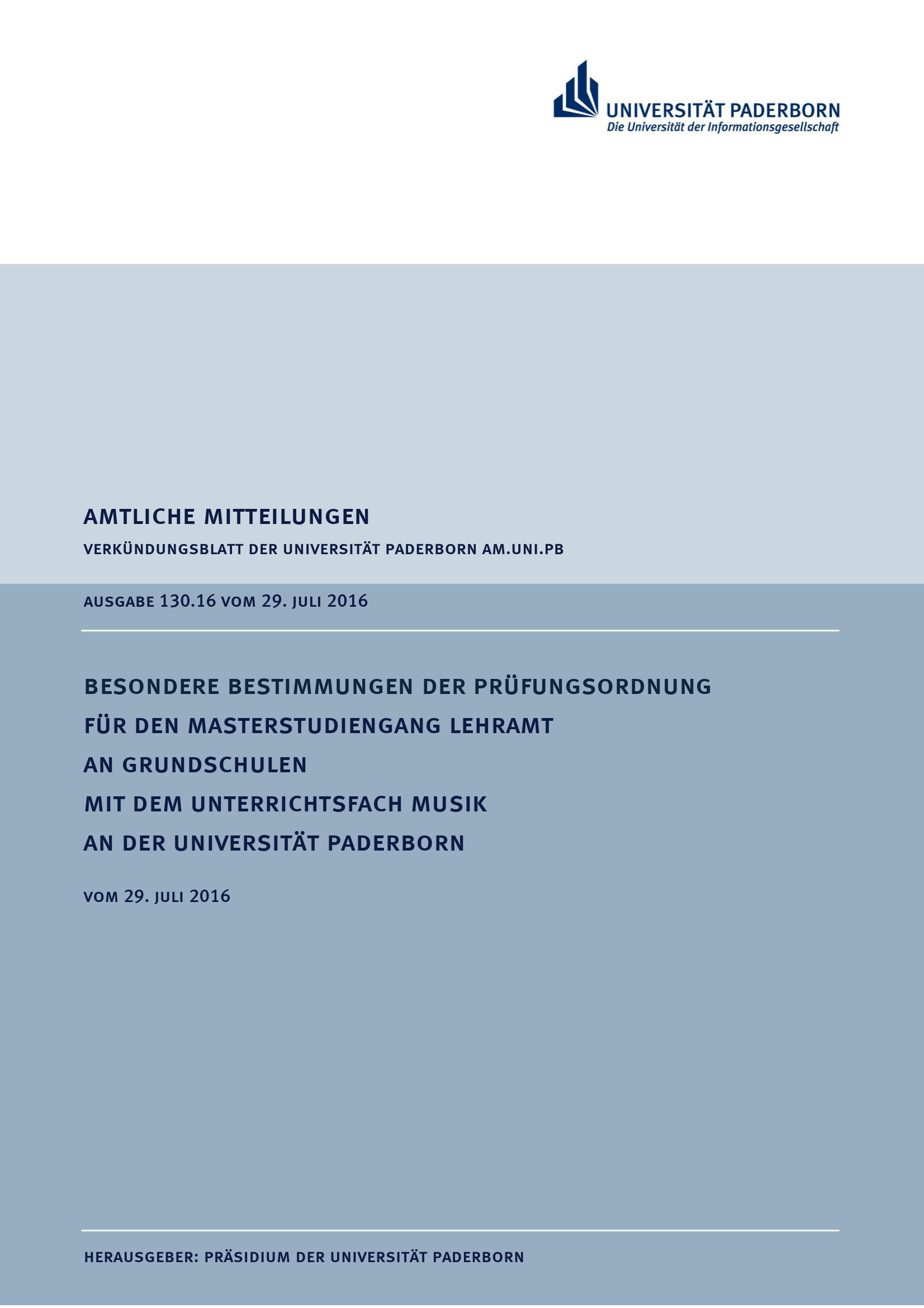 Besondere Bestimmungen der Prüfungsordnung für den Masterstudiengang Lehramt an Grundschulen mit dem Unterrichtsfach Musik an der Universität Paderborn : vom 29. Juli 2016