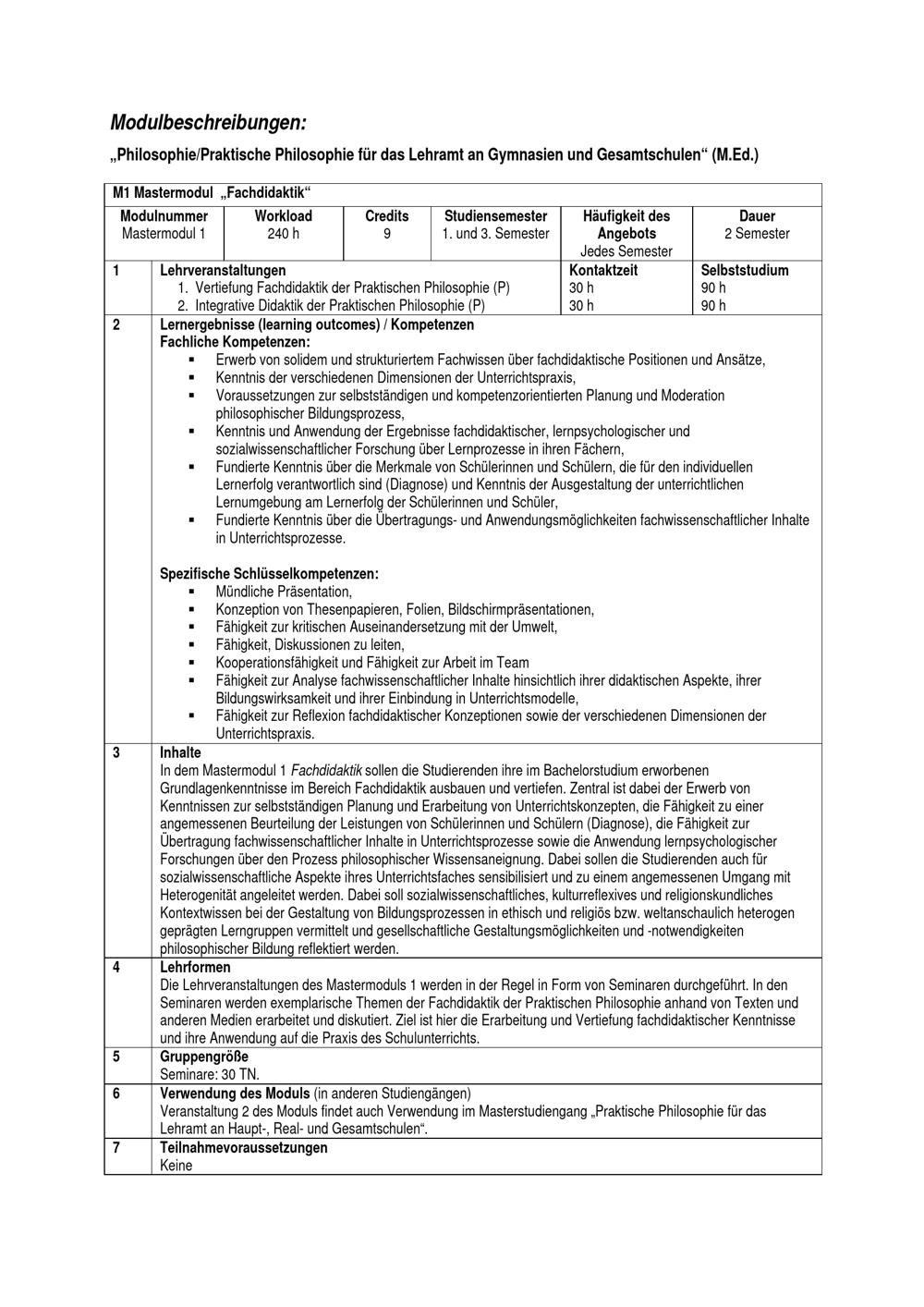 Besondere Bestimmungen der Prüfungsordnung für den Masterstudiengang Lehramt an Gymnasien und Gesamtschulen mit dem Unterrichtsfach Philosophie / Praktische Philosophie an der Universität Paderborn : vom 29. Juli 2016