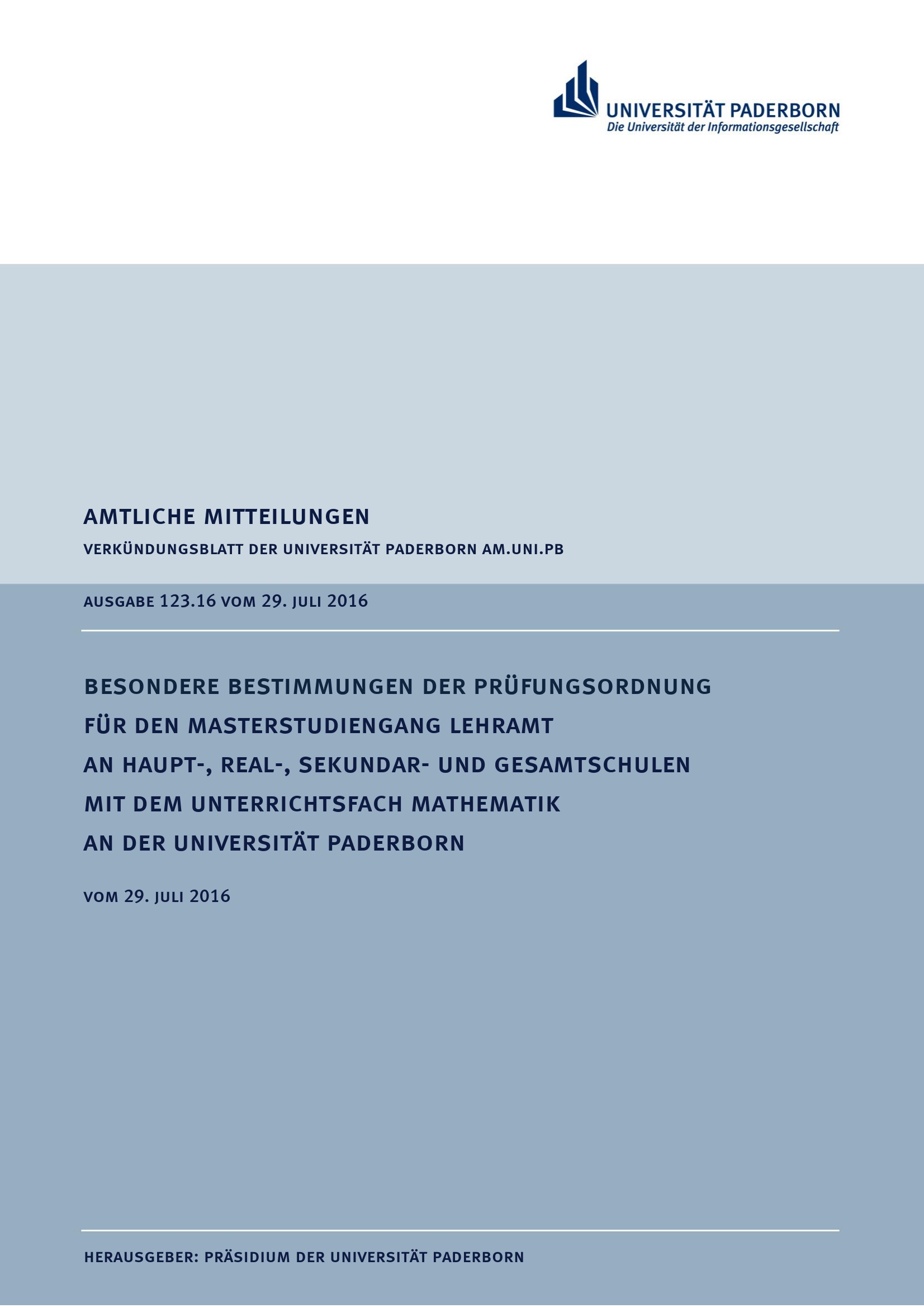 Besondere Bestimmungen der Prüfungsordnung für den Masterstudiengang Lehramt an Haupt-, Real-, Sekundar- und Gesamtschulen mit dem Unterrichtsfach Mathematik an der Universität Paderborn : vom 29. Juli 2016