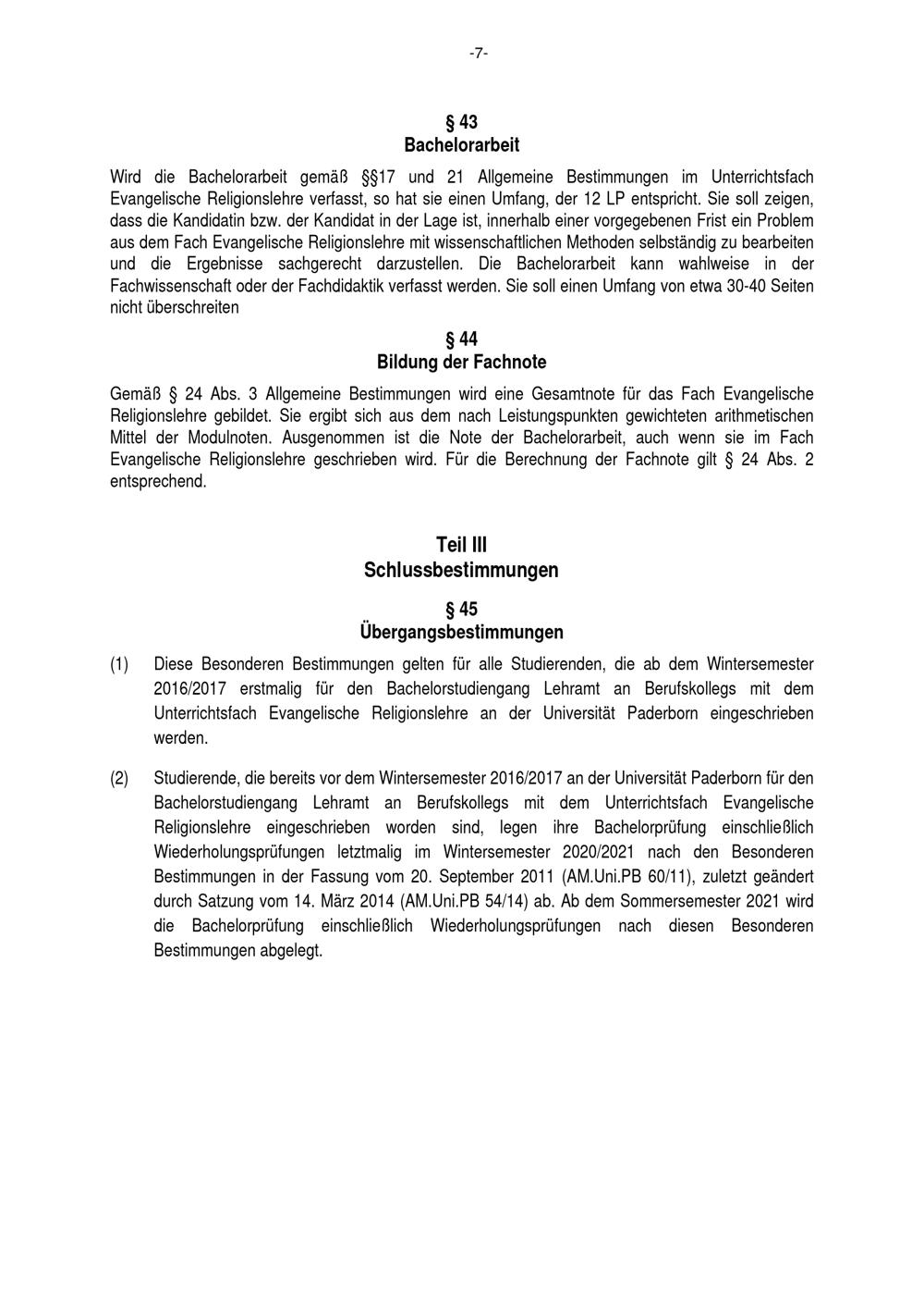 Besondere Bestimmungen der Prüfungsordnung für den Bachelorstudiengang Lehramt an Berufskollegs mit dem Unterrichtsfach Evangelische Religionslehre an der Universität Paderborn : vom 29. Juli 2016