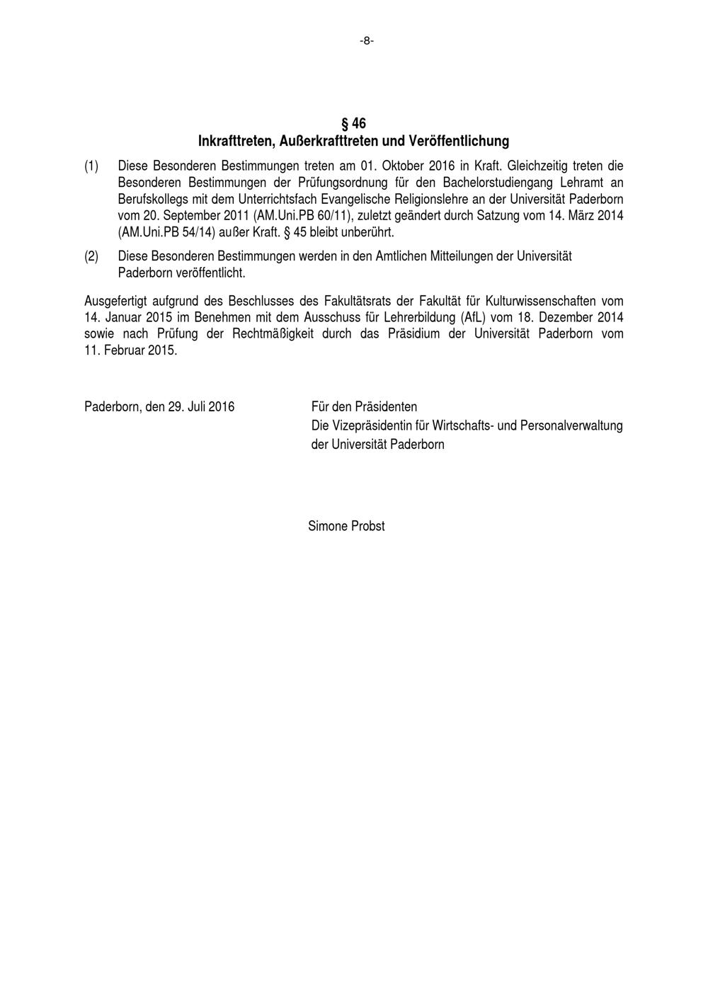 Besondere Bestimmungen der Prüfungsordnung für den Bachelorstudiengang Lehramt an Berufskollegs mit dem Unterrichtsfach Evangelische Religionslehre an der Universität Paderborn : vom 29. Juli 2016