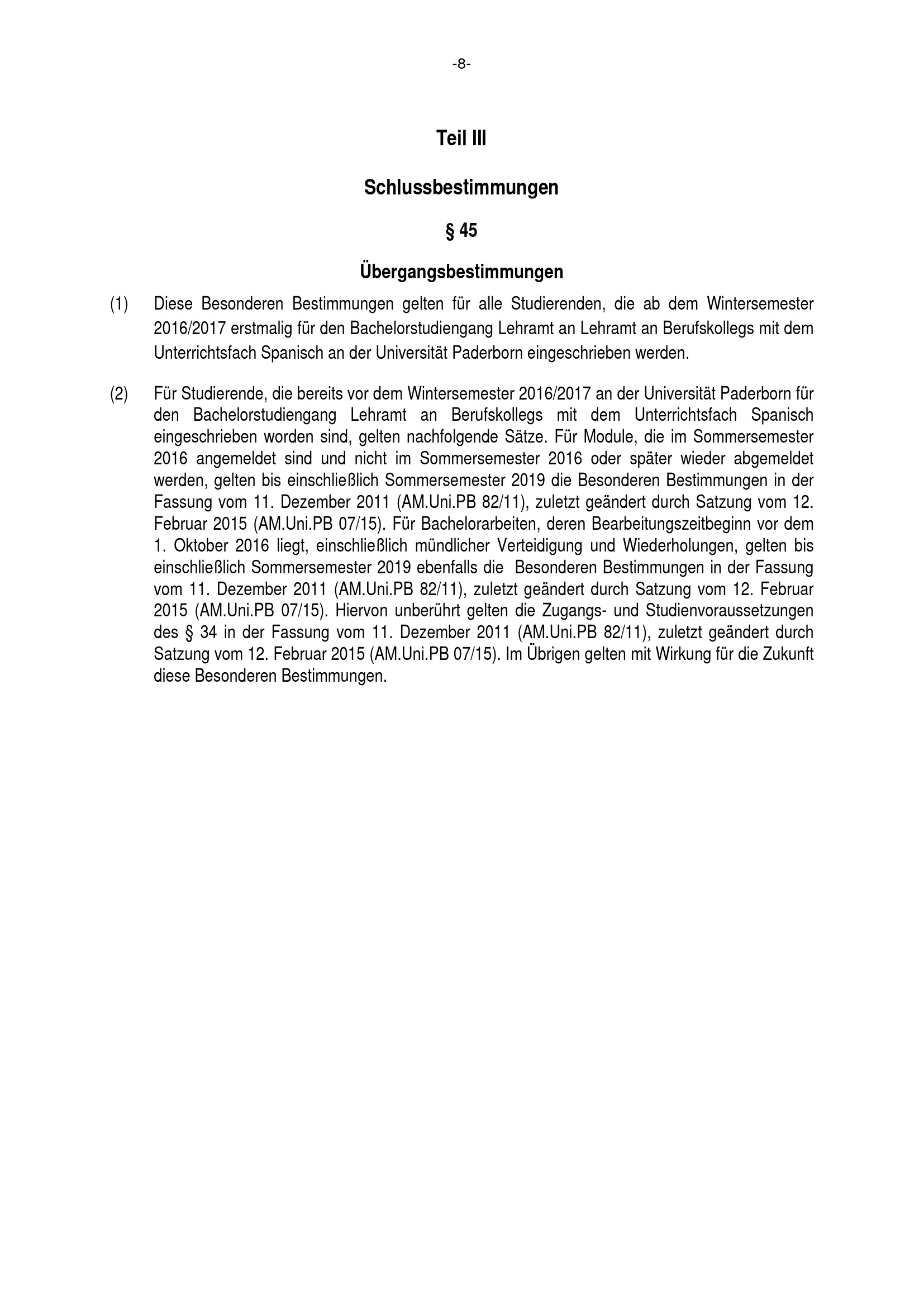 Besondere Bestimmungen der Prüfungsordnung für den Bachelorstudiengang Lehramt an Berufskollegs mit dem Unterrichtsfach Spanisch an der Universität Paderborn : vom 29. Juli 2016