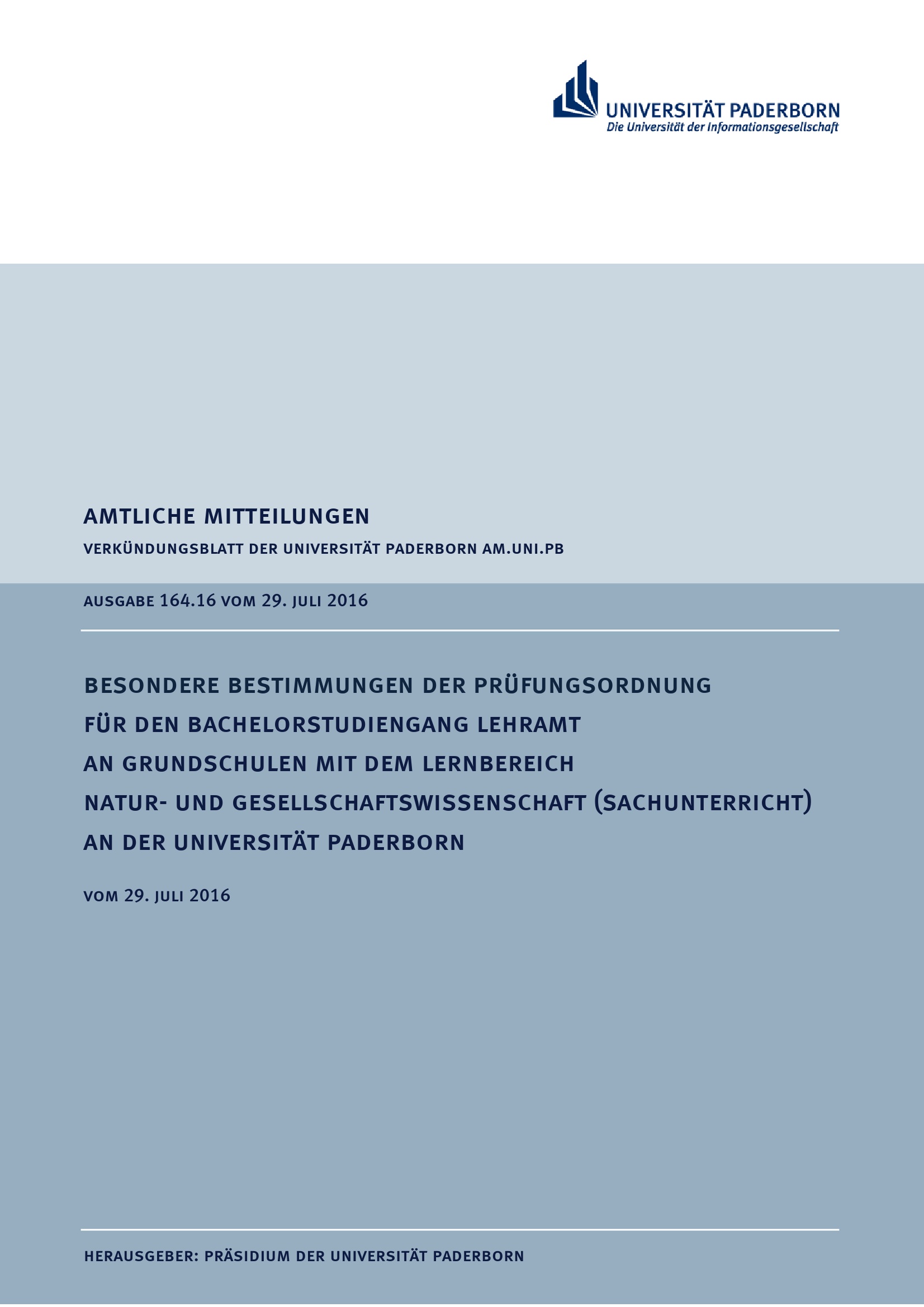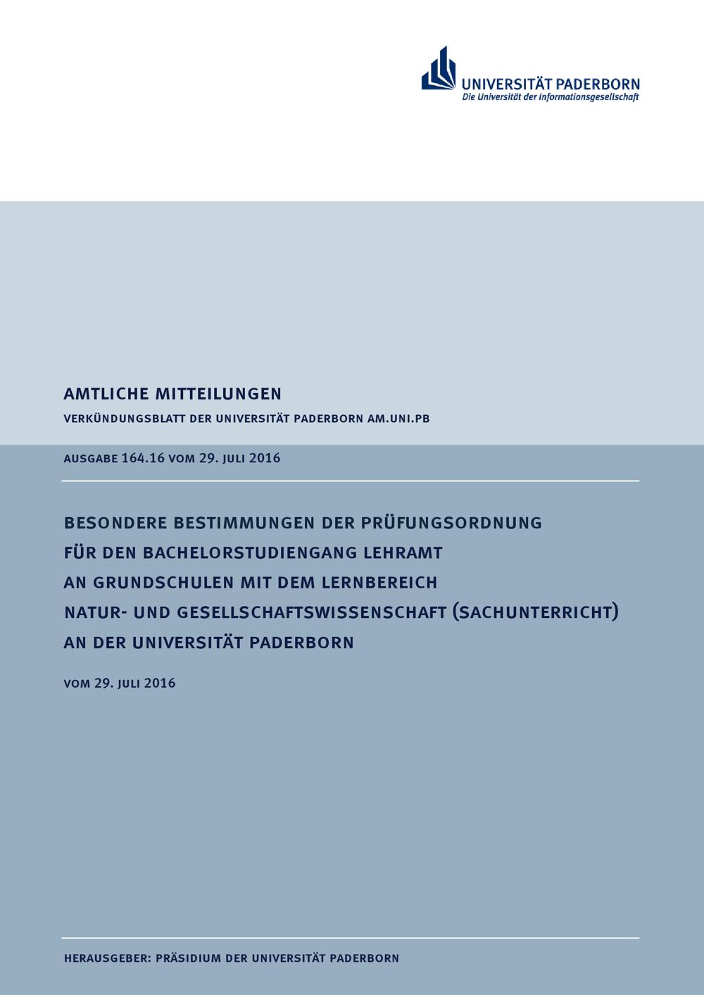 Besondere Bestimmungen der Prüfungsordnung für den Bachelorstudiengang Lehramt an Grundschulen mit dem Lernbereich Natur- und Gesellschaftswissenschaft (Sachunterricht) an der Universität Paderborn : vom 29. Juli 2016