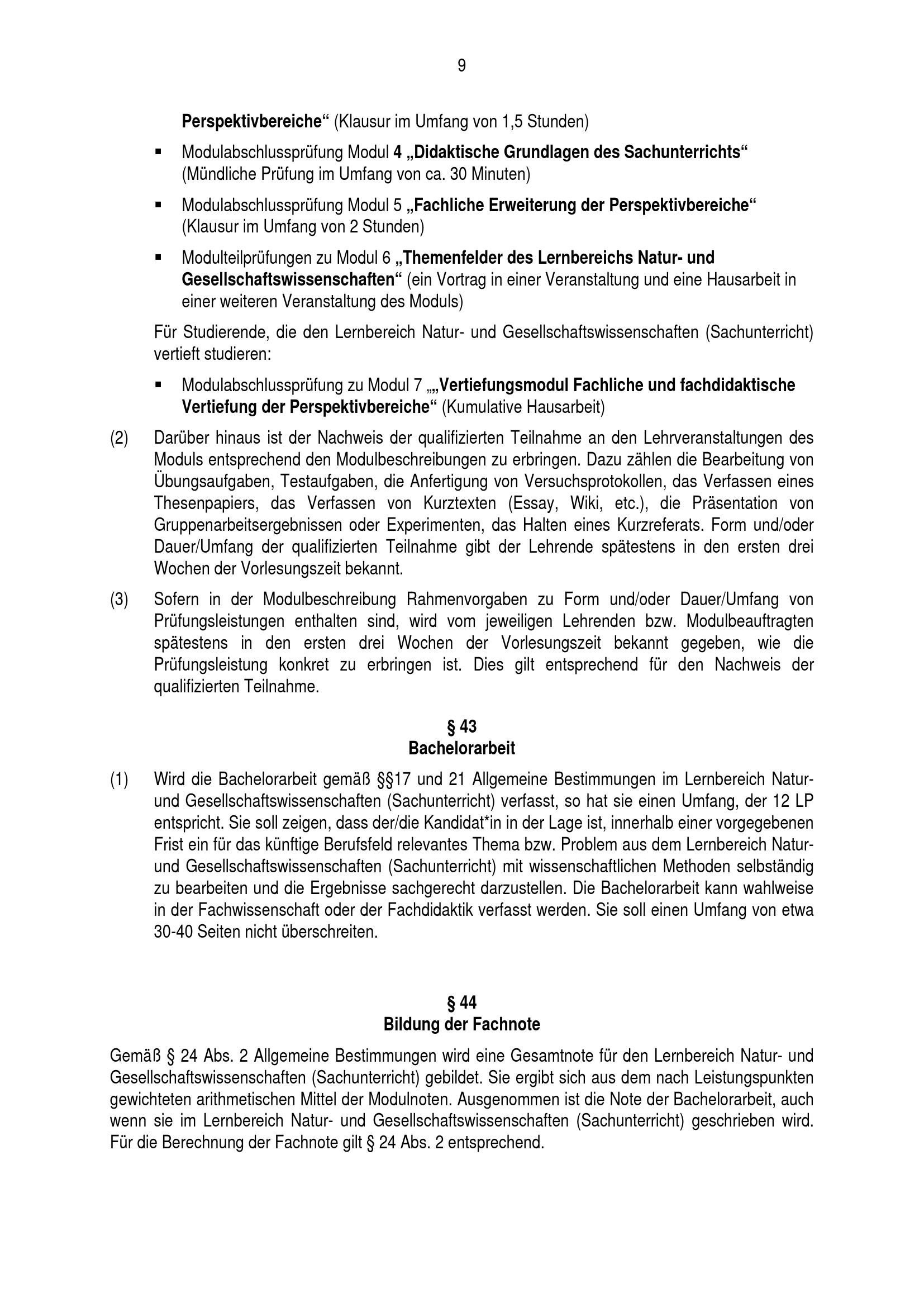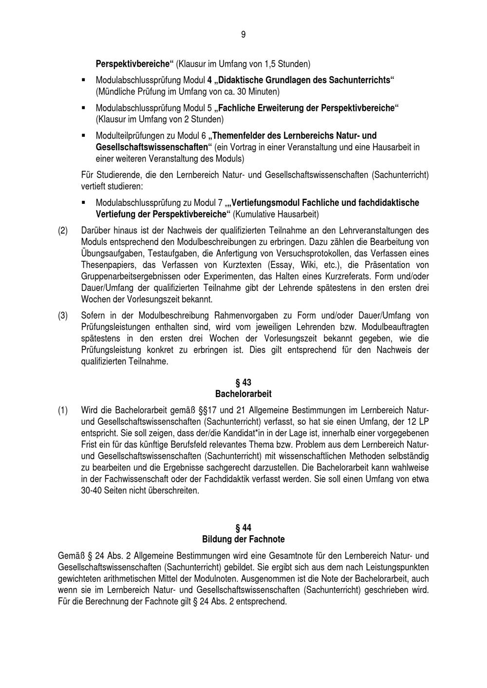 Besondere Bestimmungen der Prüfungsordnung für den Bachelorstudiengang Lehramt an Grundschulen mit dem Lernbereich Natur- und Gesellschaftswissenschaft (Sachunterricht) an der Universität Paderborn : vom 29. Juli 2016