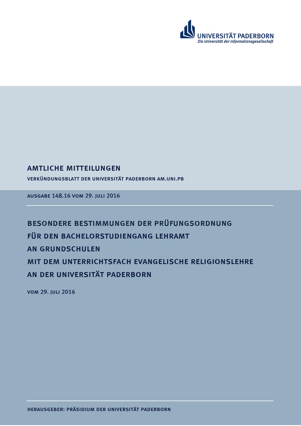 Besondere Bestimmungen der Prüfungsordnung für den Bachelorstudiengang Lehramt an Grundschulen mit dem Unterrichtsfach Evangelische Religionslehre an der Universität Paderborn : vom 29. Juli 2016