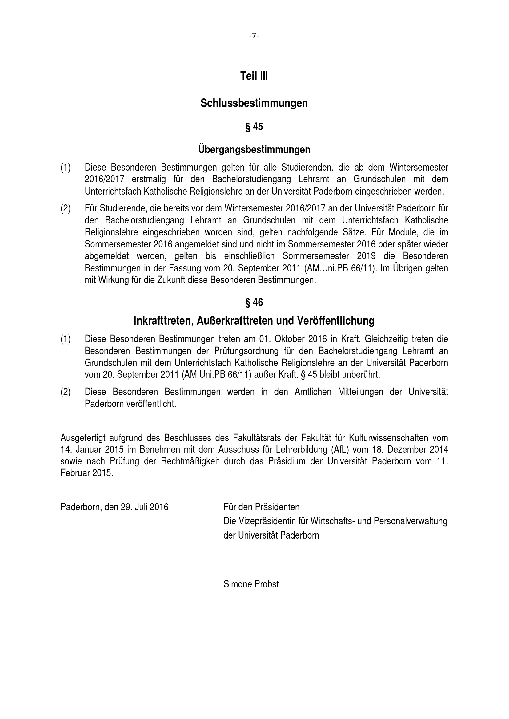 Besondere Bestimmungen der Prüfungsordnung für den Bachelorstudiengang Lehramt an Grundschulen mit dem Unterrichtsfach Katholische Religionslehre an der Universität Paderborn : vom 29. Juli 2016
