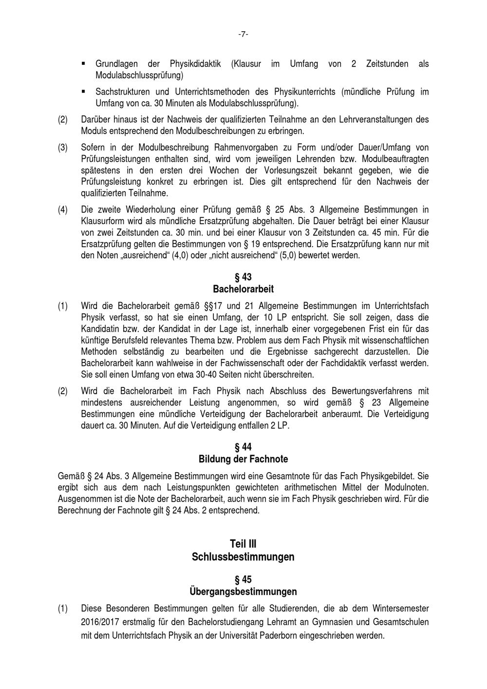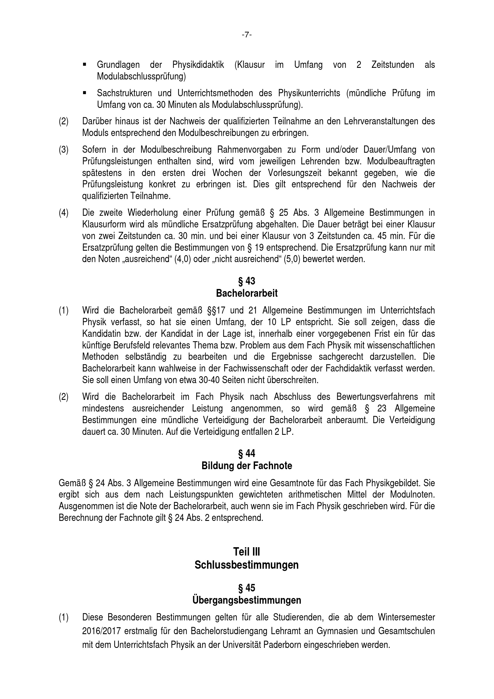 Besondere Bestimmungen der Prüfungsordnung für den Bachelorstudiengang Lehramt an Gymnasien und Gesamtschulen mit dem Unterrichtsfach Physik an der Universität Paderborn : vom 29. Juli 2016