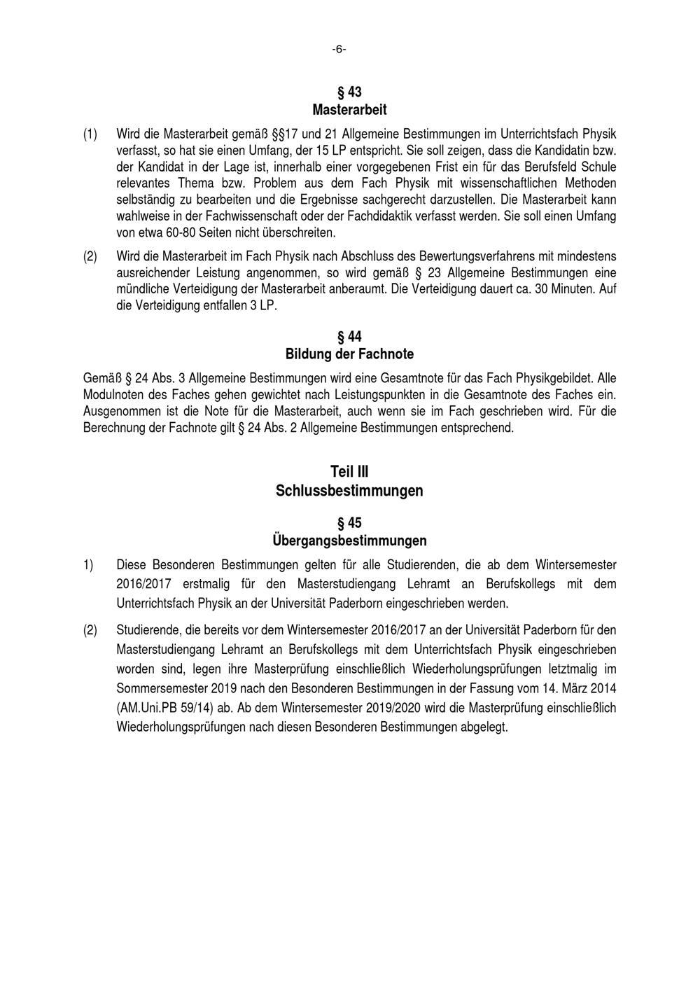 Besondere Bestimmungen der Prüfungsordnung für den Masterstudiengang Lehramt an Berufskollegs mit dem Unterrichtsfach Physik an der Universität Paderborn : vom 29. Juli 2016