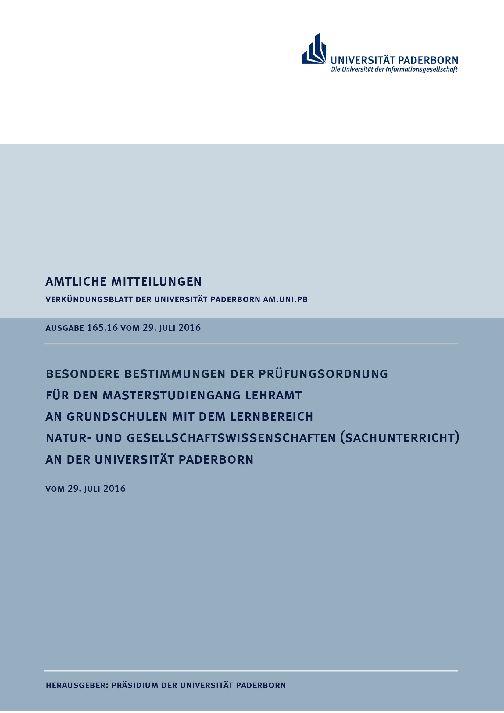Besondere Bestimmungen der Prüfungsordnung für den Masterstudiengang Lehramt an Grundschulen mit dem Lernbereich Natur- und Gesellschaftswissenschaften (Sachunterricht) an der Universität Paderborn : vom 29. Juli 2016