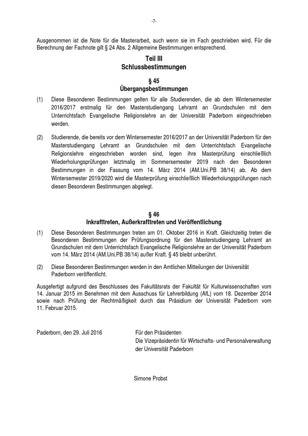 Besondere Bestimmungen der Prüfungsordnung für den Masterstudiengang Lehramt an Grundschulen mit dem Unterrichtsfach Evangelische Religionslehre an der Universität Paderborn : vom 29. Juli 2016