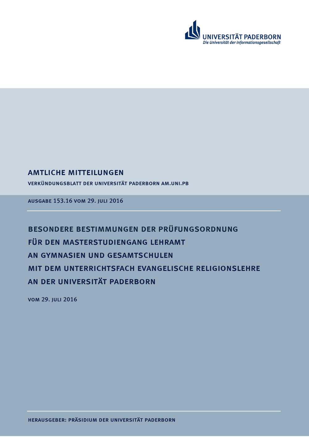 Besondere Bestimmungen der Prüfungsordnung für den Masterstudiengang Lehramt an Gymnasien und Gesamtschulen mit dem Unterrichtsfach Evangelische Religionslehre an der Universität Paderborn : vom 29. Juli 2016