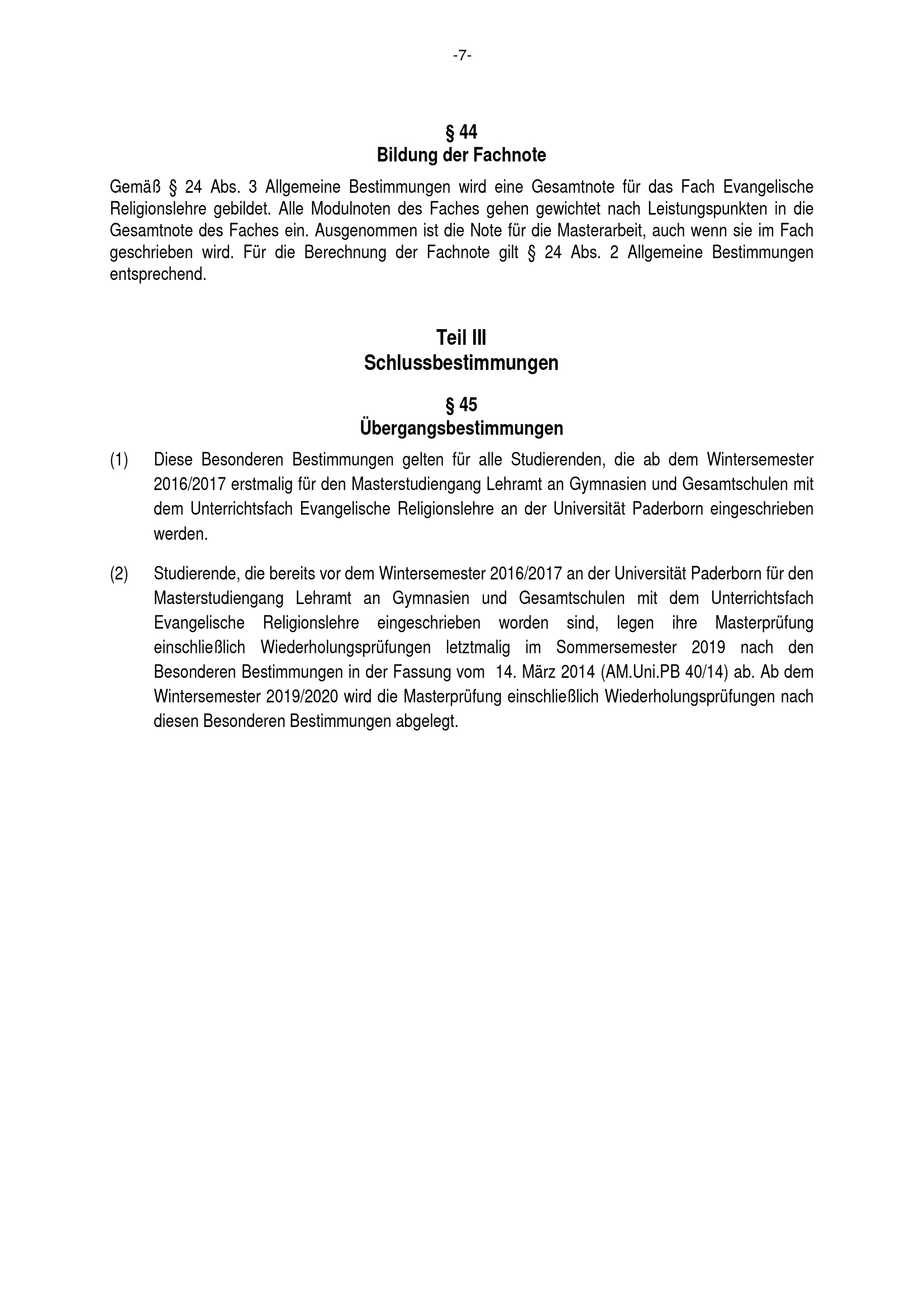 Besondere Bestimmungen der Prüfungsordnung für den Masterstudiengang Lehramt an Gymnasien und Gesamtschulen mit dem Unterrichtsfach Evangelische Religionslehre an der Universität Paderborn : vom 29. Juli 2016