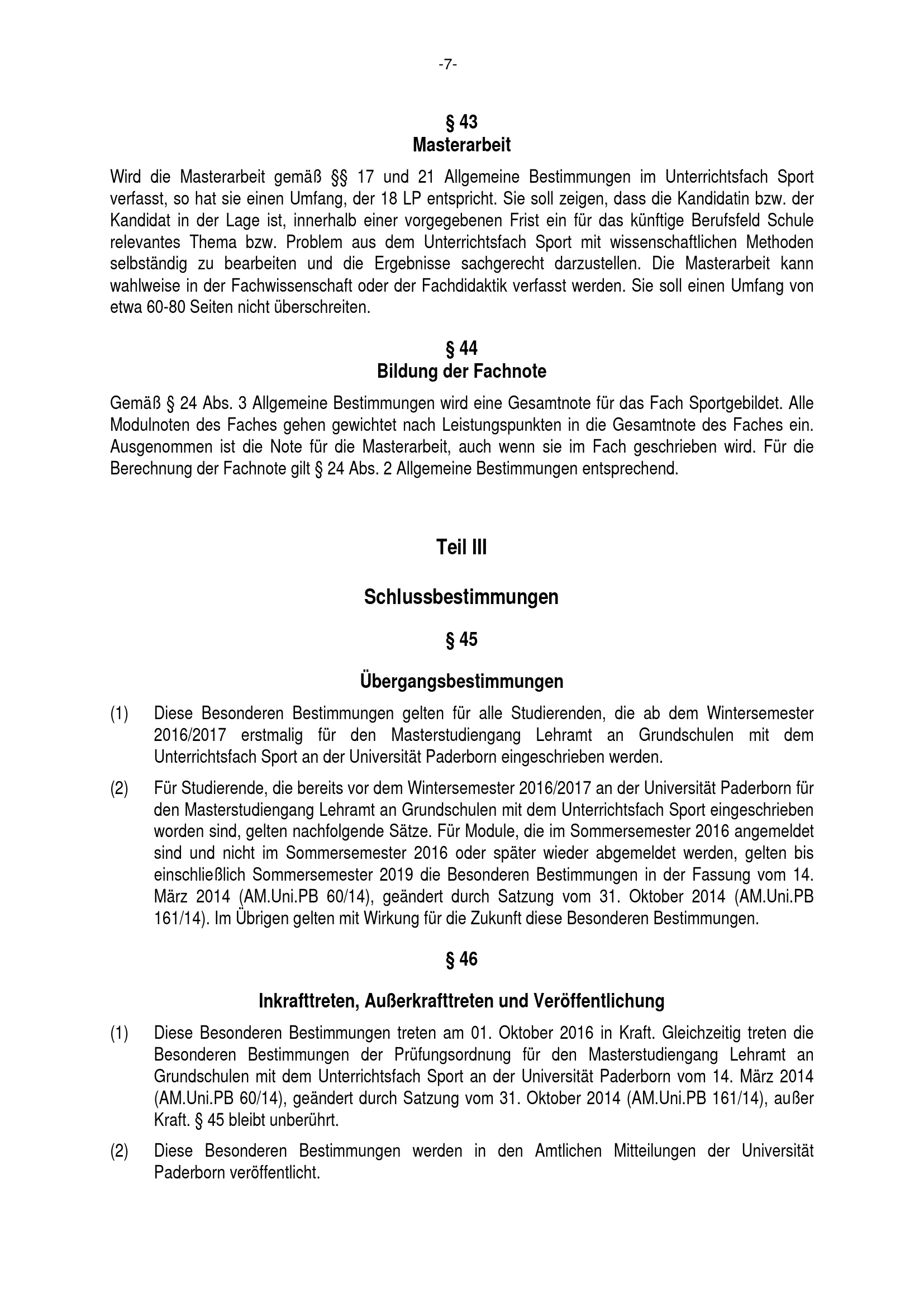 Besondere Bestimmungen der Prüfungsordnung für den Masterstudiengang Lehramt an Grundschulen mit dem Unterrichtsfach Sport an der Universität Paderborn : vom 29. Juli 2016