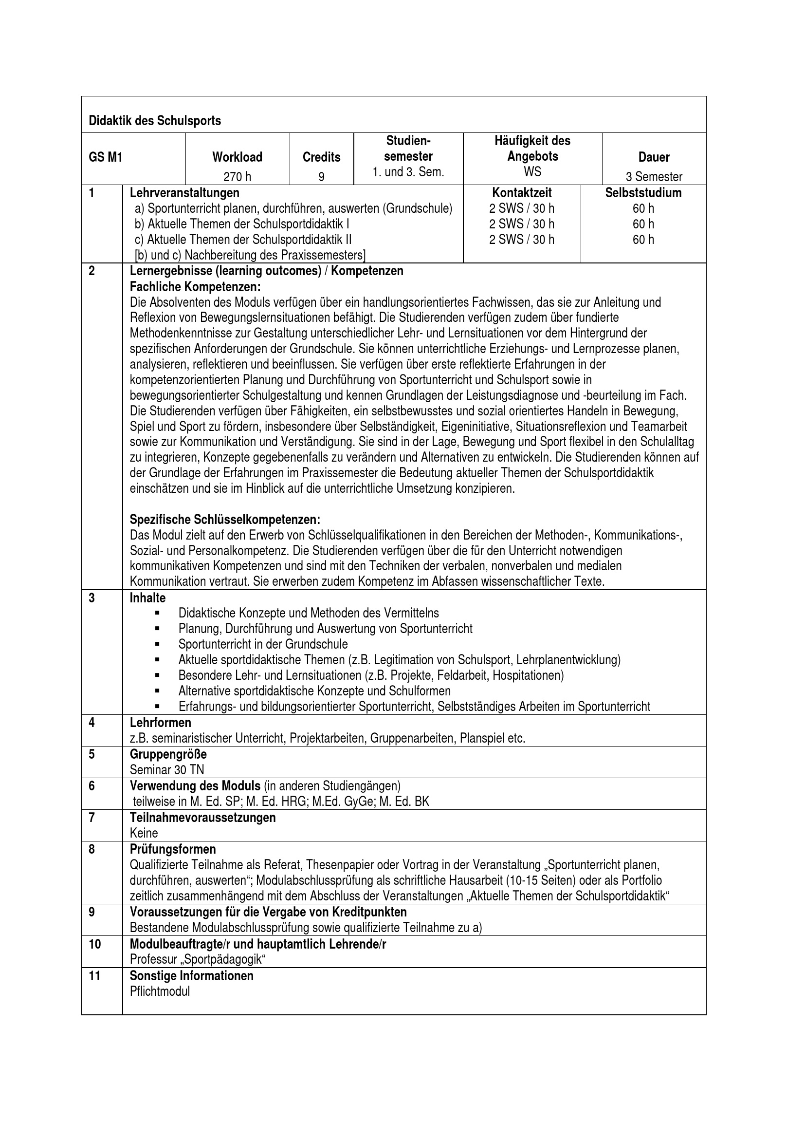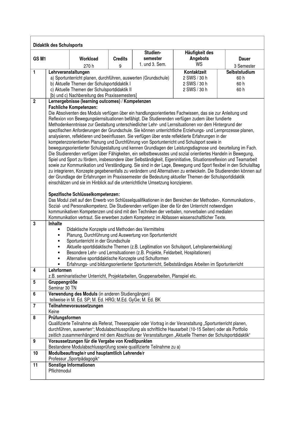 Besondere Bestimmungen der Prüfungsordnung für den Masterstudiengang Lehramt an Grundschulen mit dem Unterrichtsfach Sport an der Universität Paderborn : vom 29. Juli 2016