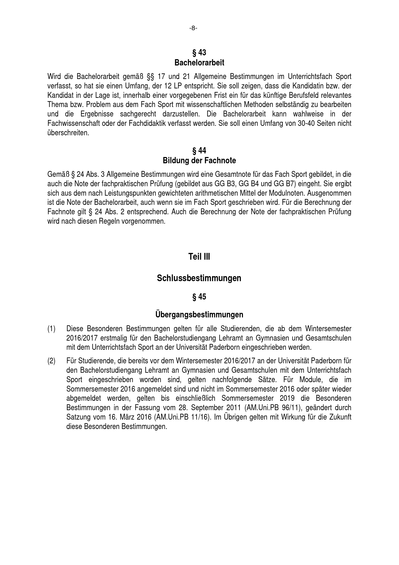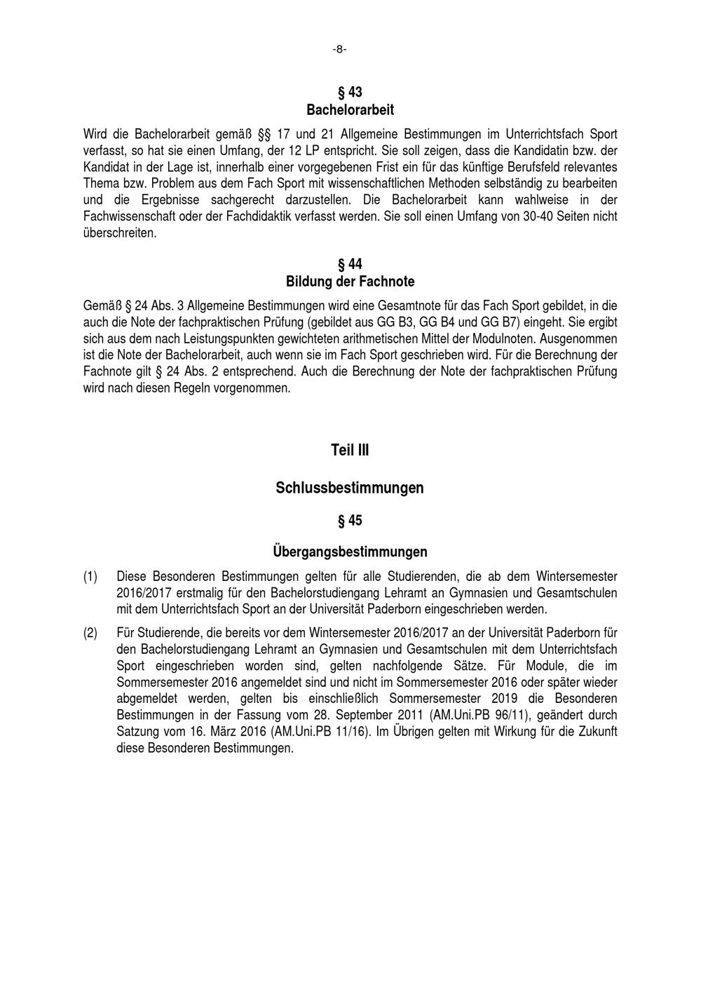 Besondere Bestimmungen der Prüfungsordnung für den Bachelorstudiengang Lehramt an Gymnasien und Gesamtschulen mit dem Unterrichtsfach Sport an der Universität Paderborn : vom 29. Juli 2016