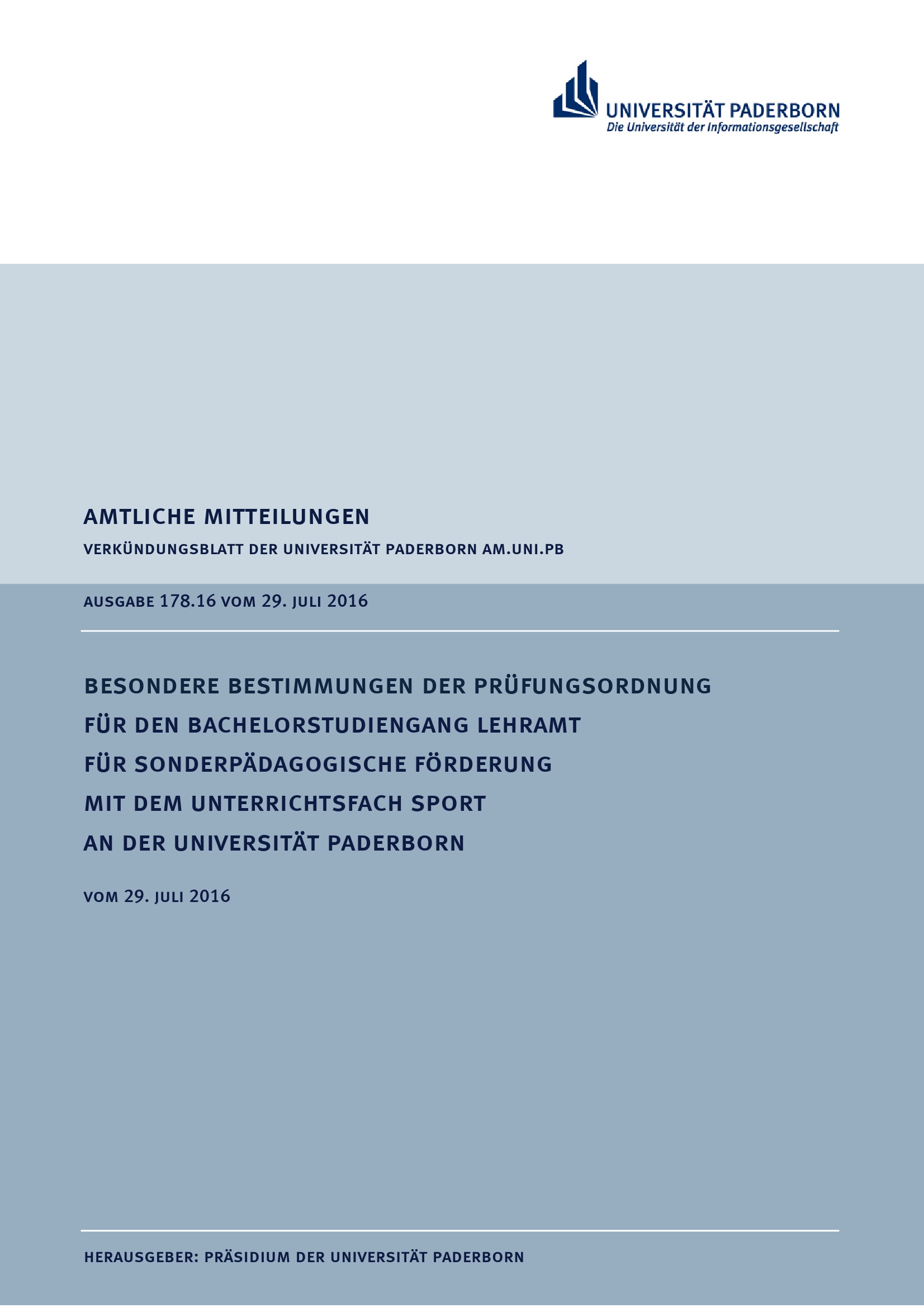 Besondere Bestimmungen der Prüfungsordnung für den Bachelorstudiengang Lehramt für sonderpädagogische Förderung mit dem Unterrichtsfach Sport an der Universität Paderborn : vom 29. Juli 2016