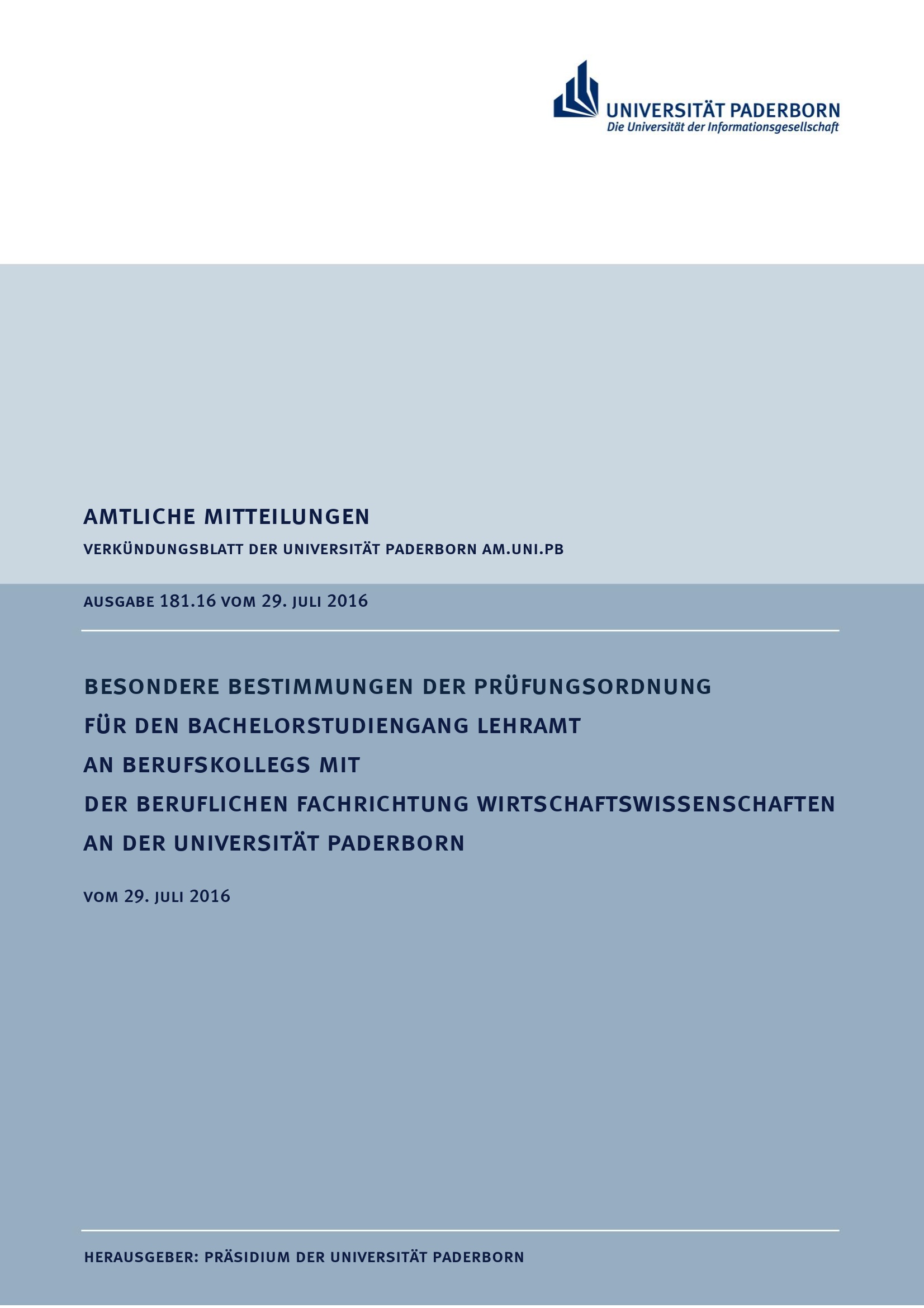 Besondere Bestimmungen der Prüfungsordnung für den Bachelorstudiengang Lehramt an Berufskollegs mit der beruflichen Fachrichtung Wirtschaftswissenschaften an der Universität Paderborn : vom 29. Juli 2016