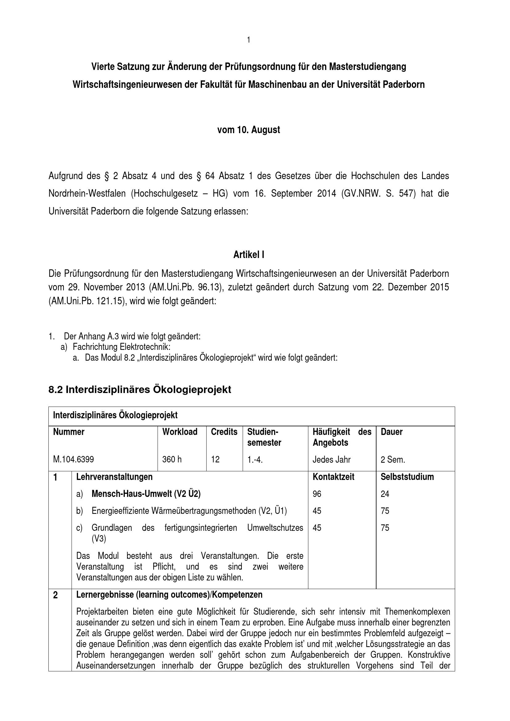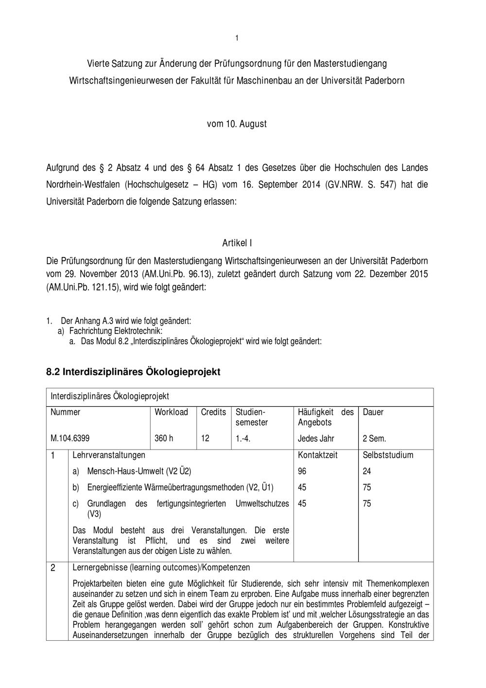 Vierte Satzung zur Änderung der Prüfungsordnung für den Masterstudiengang Wirtschaftsingenieurwesen der Fakultät für Maschinenbau an der Universität Paderborn : vom 10. August 2016