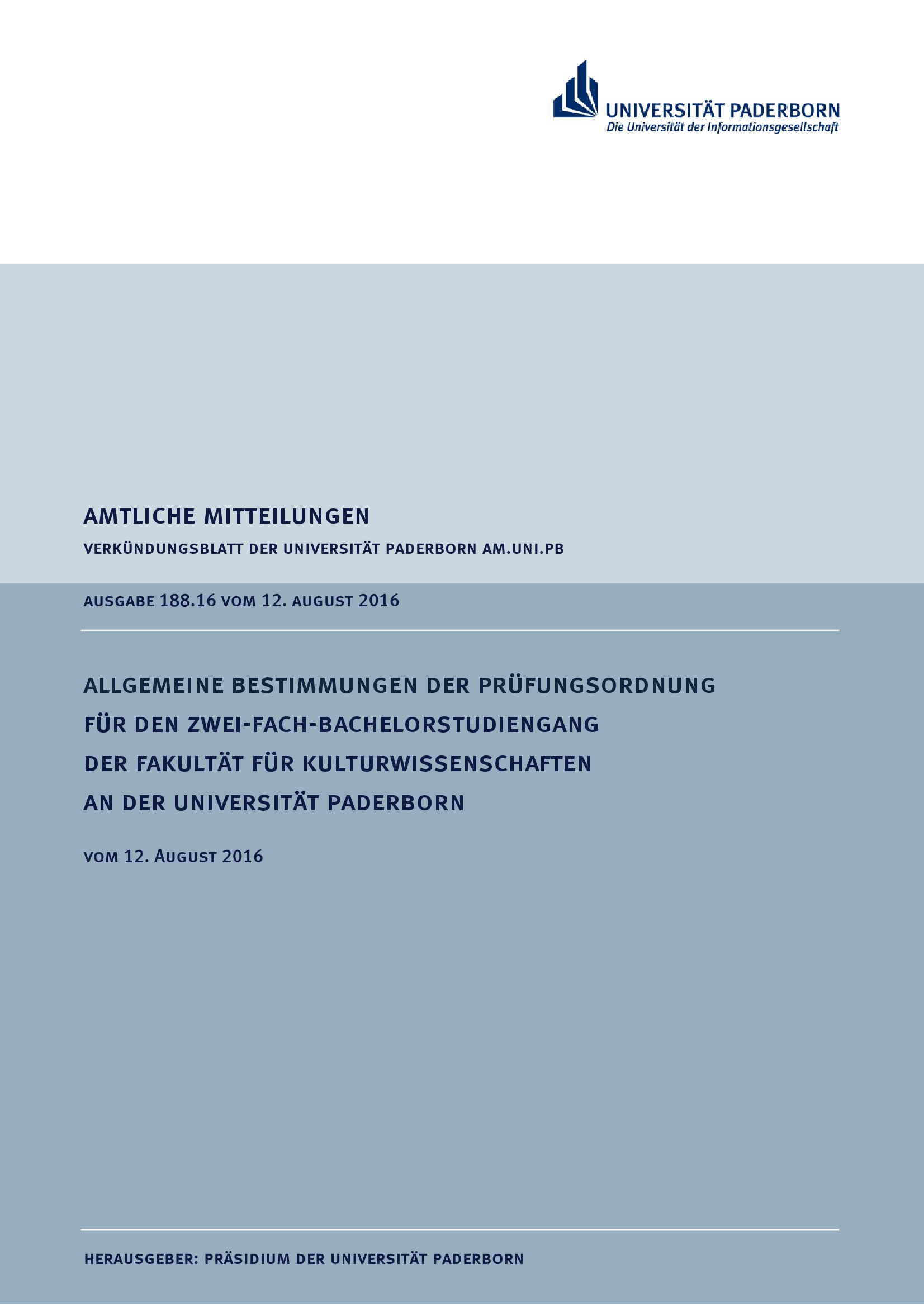 Allgemeine Bestimmungen der Prüfungsordnung für den Zwei-Fach-Bachelorstudiengang der Fakultät für Kulturwissenschaften an der Universität Paderborn : vom 12. August 2016