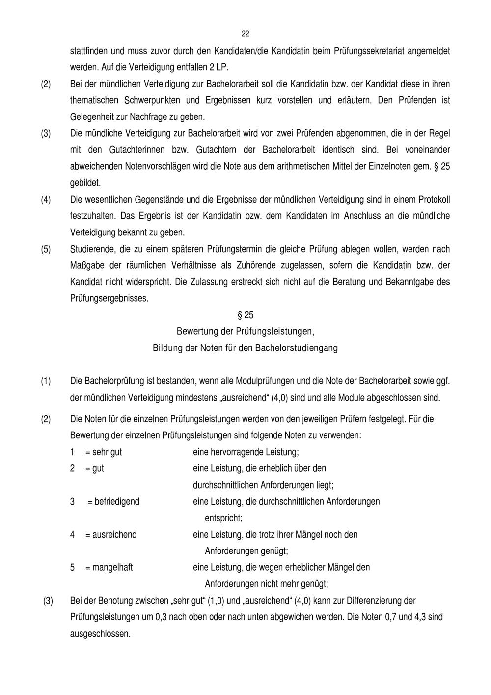 § 25 Bewertung der Prüfungsleistungen, Bildung der Noten für den Bachelorstudien[...]