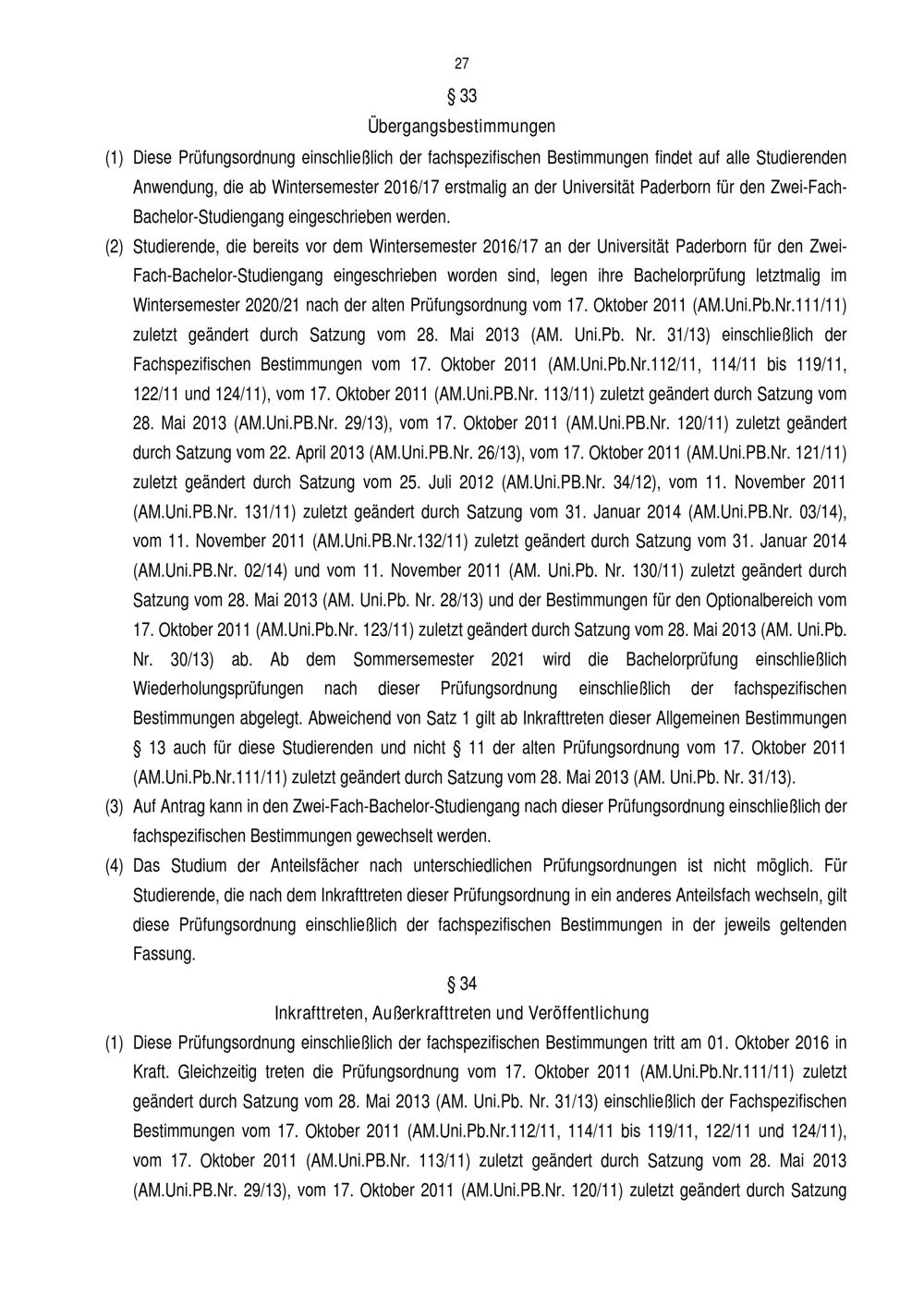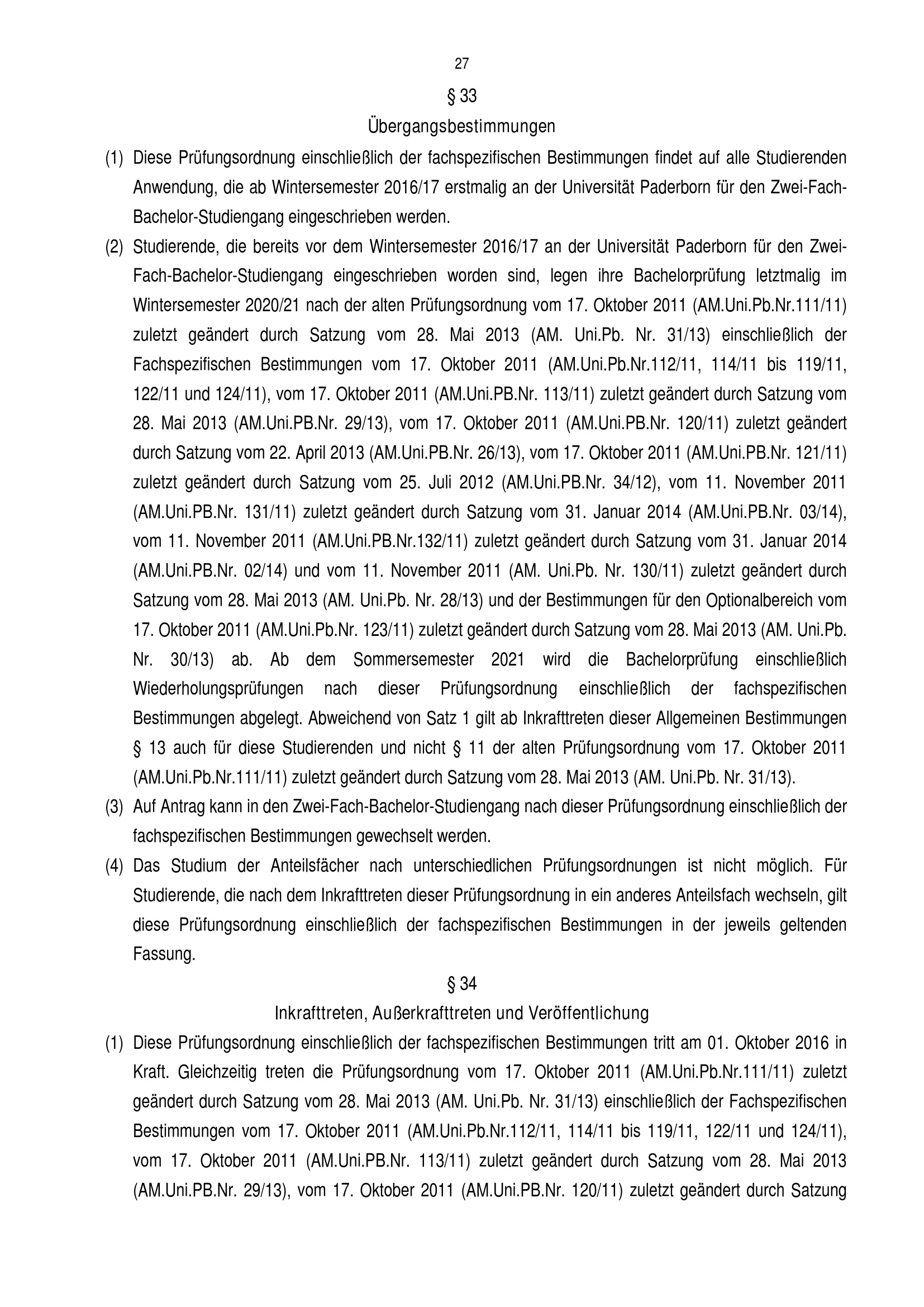 Allgemeine Bestimmungen der Prüfungsordnung für den Zwei-Fach-Bachelorstudiengang der Fakultät für Kulturwissenschaften an der Universität Paderborn : vom 12. August 2016