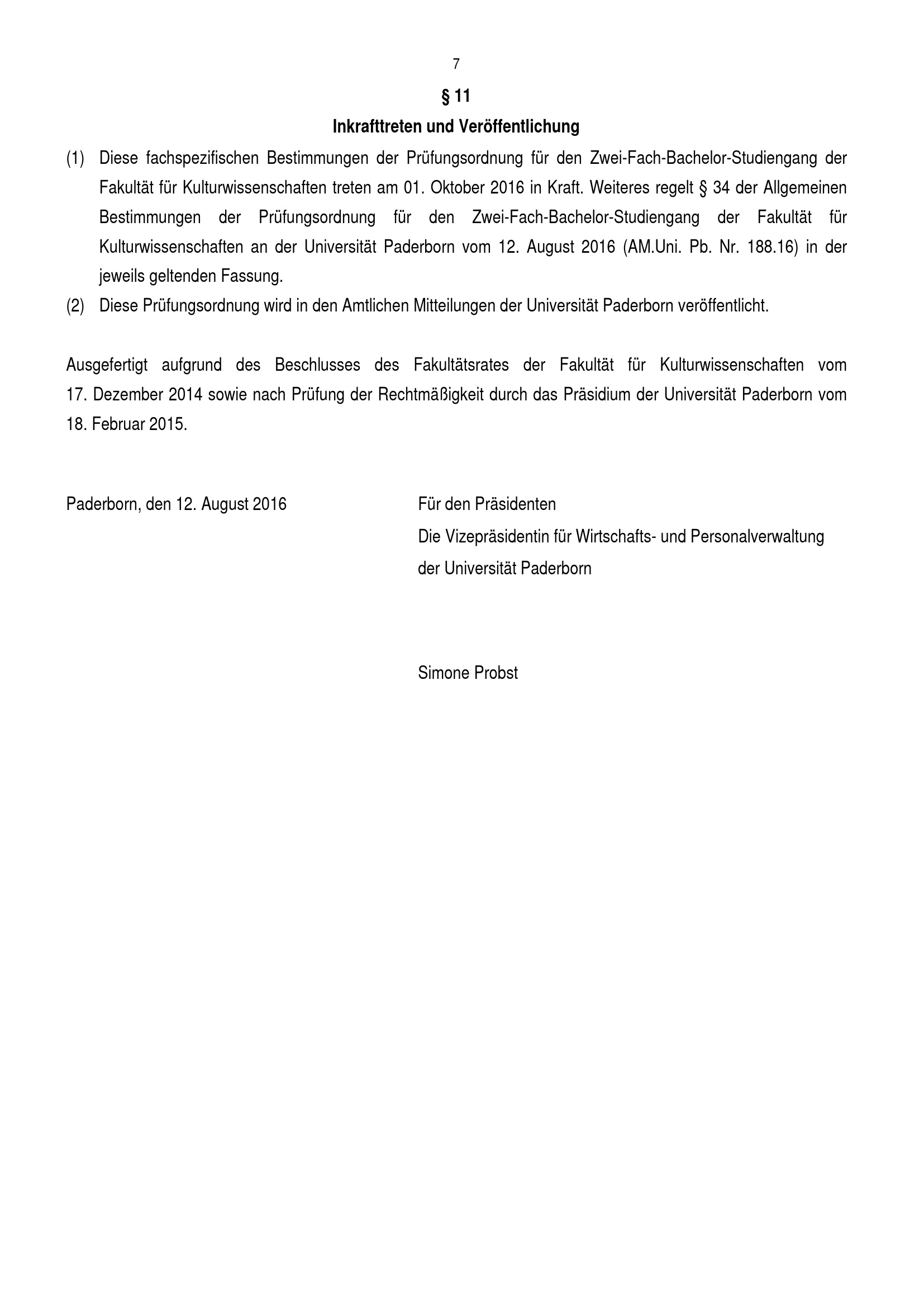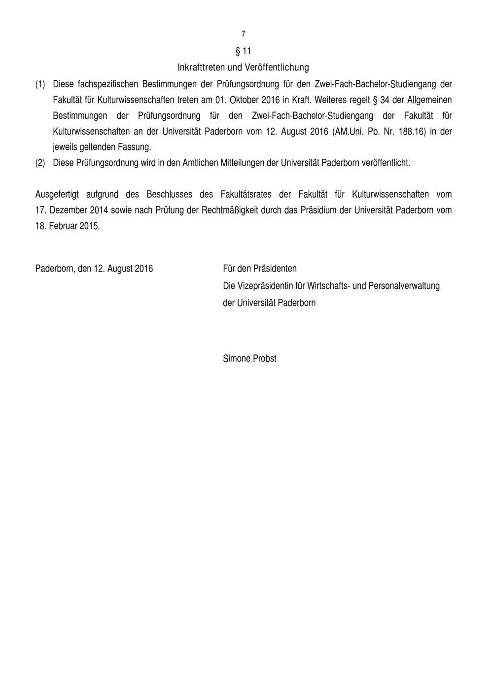 Fachspezifische Bestimmungen für das Fach Philosophie der Prüfungsordnung für den Zwei-Fach-Bachelorstudiengang der Fakultät für Kulturwissenschaften an der Universität Paderborn : vom 12. August 2016