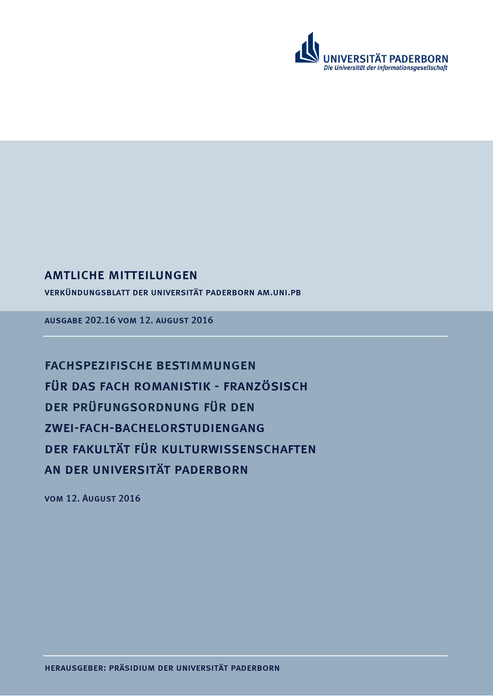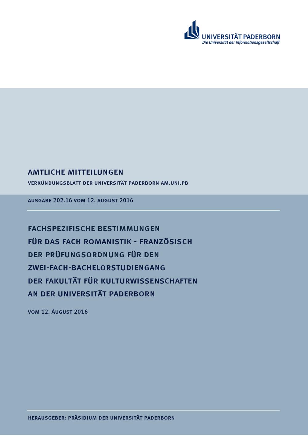 Fachspezifische Bestimmungen für das Fach Romanistik - Französisch der Prüfungsordnung für den Zwei-Fach-Bachelorstudiengang der Fakultät für Kulturwissenschaften an der Universität Paderborn : vom 12. August 2016