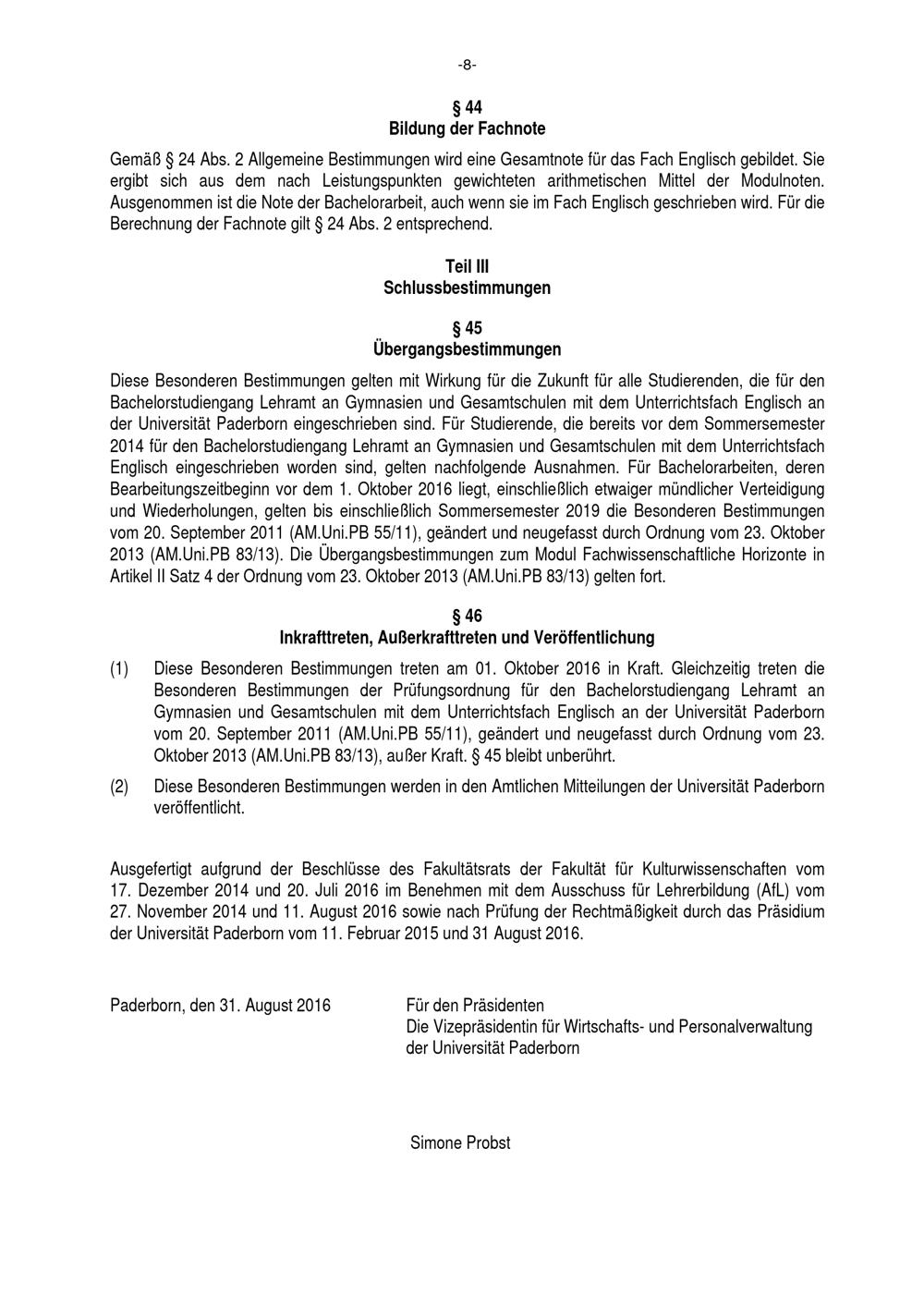 Besondere Bestimmungen der Prüfungsordnung für den Bachelorstudiengang Lehramt an Gymnasien und Gesamtschulen mit dem Unterrichtsfach Englisch an der Universität Paderborn : vom 31. August 2016