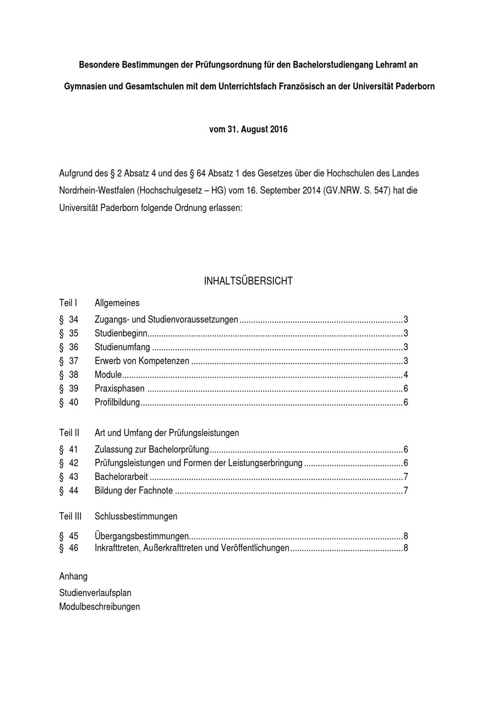 Besondere Bestimmungen der Prüfungsordnung für den Bachelorstudiengang Lehramt an Gymnasien und Gesamtschulen mit dem Unterrichtsfach Französisch an der Universität Paderborn : vom 31. August 2016
