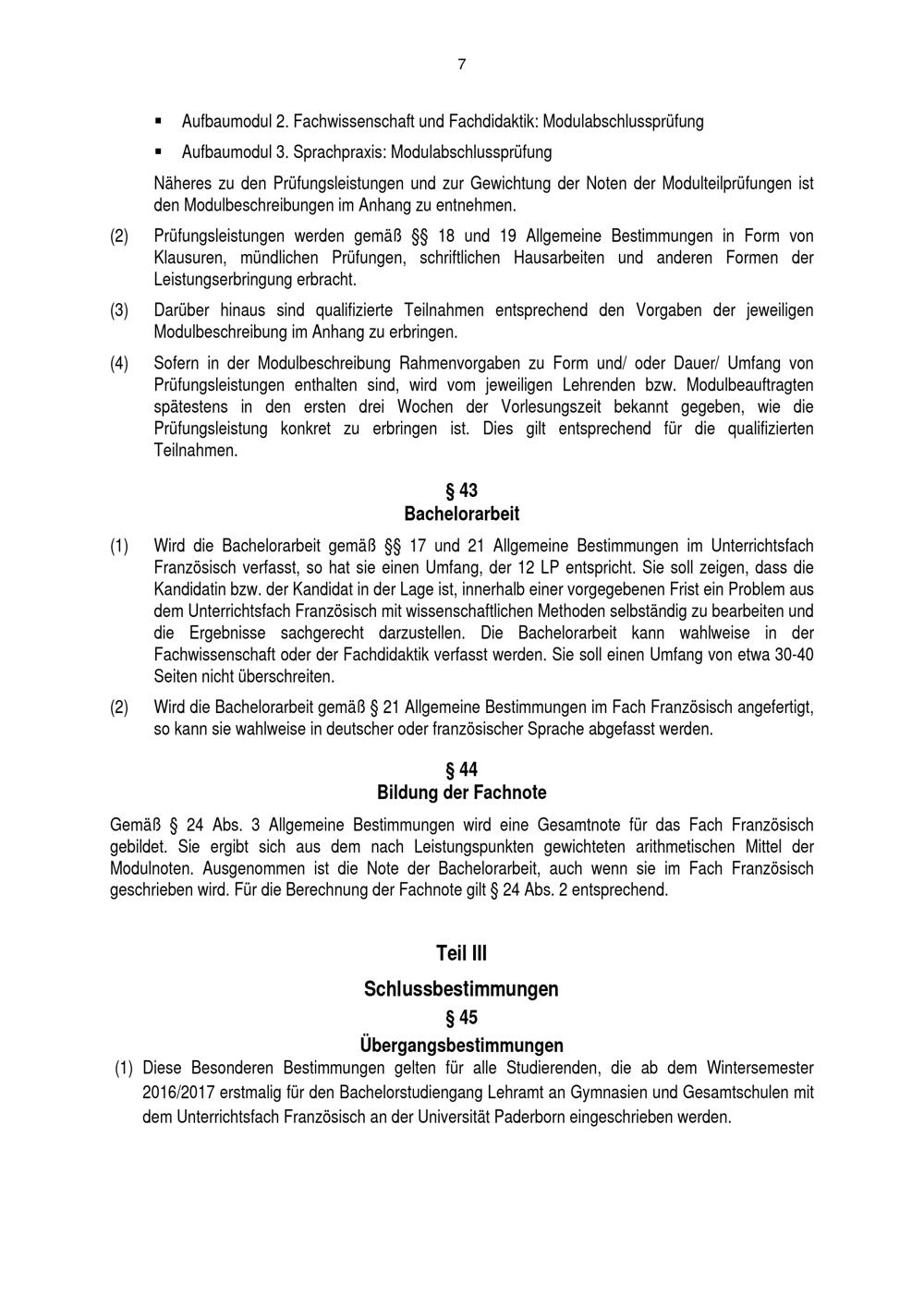 Besondere Bestimmungen der Prüfungsordnung für den Bachelorstudiengang Lehramt an Gymnasien und Gesamtschulen mit dem Unterrichtsfach Französisch an der Universität Paderborn : vom 31. August 2016
