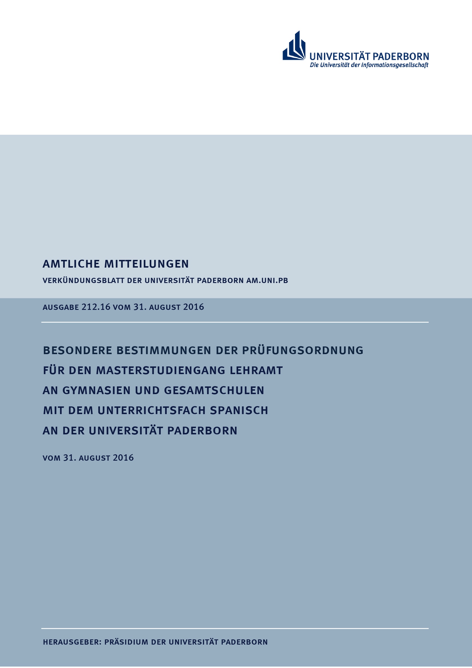 Besondere Bestimmungen der Prüfungsordnung für den Masterstudiengang Lehramt an Gymnasien und Gesamtschulen mit dem Unterrichtsfach Spanisch an der Universität Paderborn : vom 31. August 2016