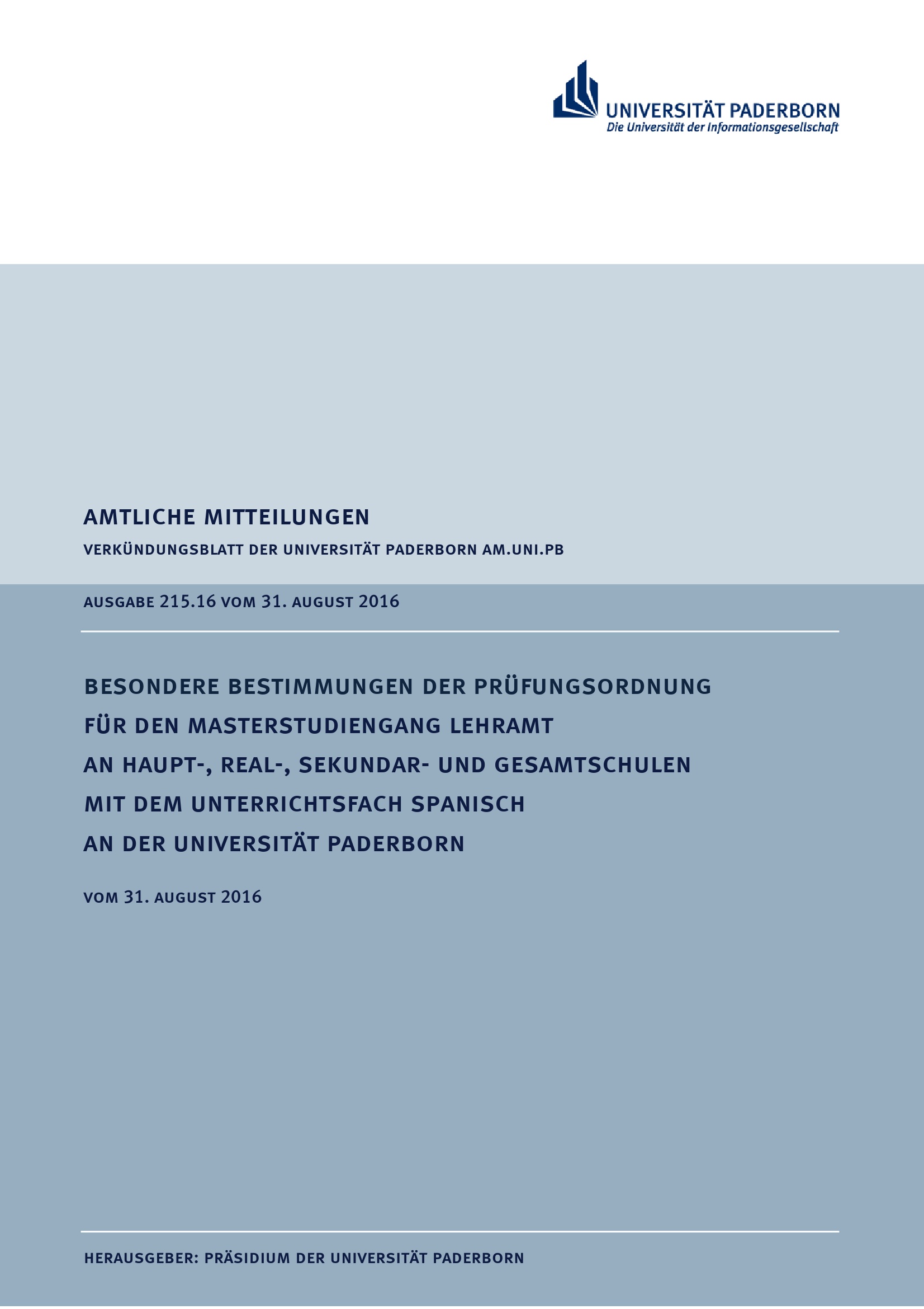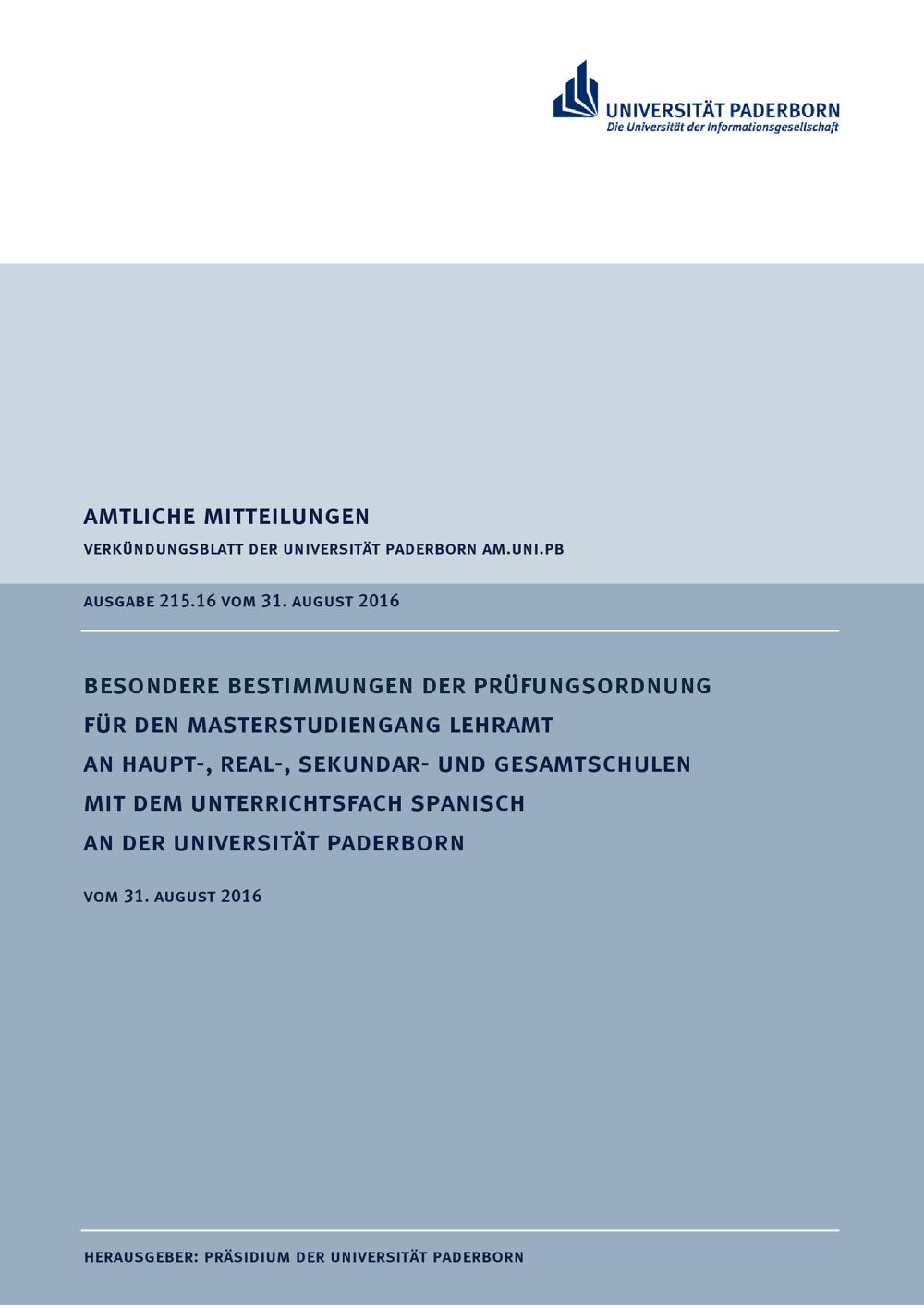 Besondere Bestimmungen der Prüfungsordnung für den Masterstudiengang Lehramt an Haupt-, Real-, Sekundar- und Gesamtschulen mit dem Unterrichtsfach Spanisch an der Universität Paderborn : vom 31. August 2016