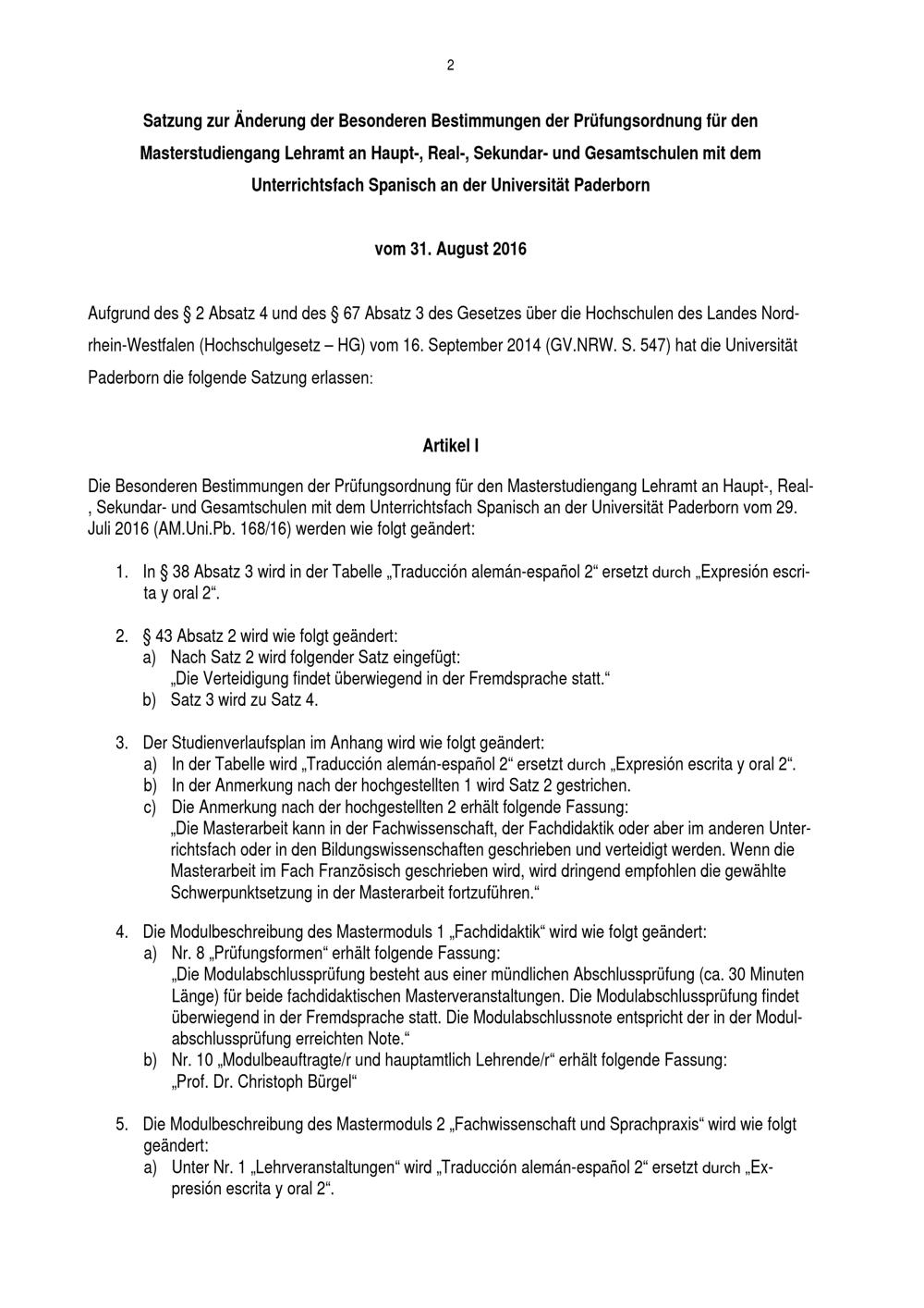 Besondere Bestimmungen der Prüfungsordnung für den Masterstudiengang Lehramt an Haupt-, Real-, Sekundar- und Gesamtschulen mit dem Unterrichtsfach Spanisch an der Universität Paderborn : vom 31. August 2016