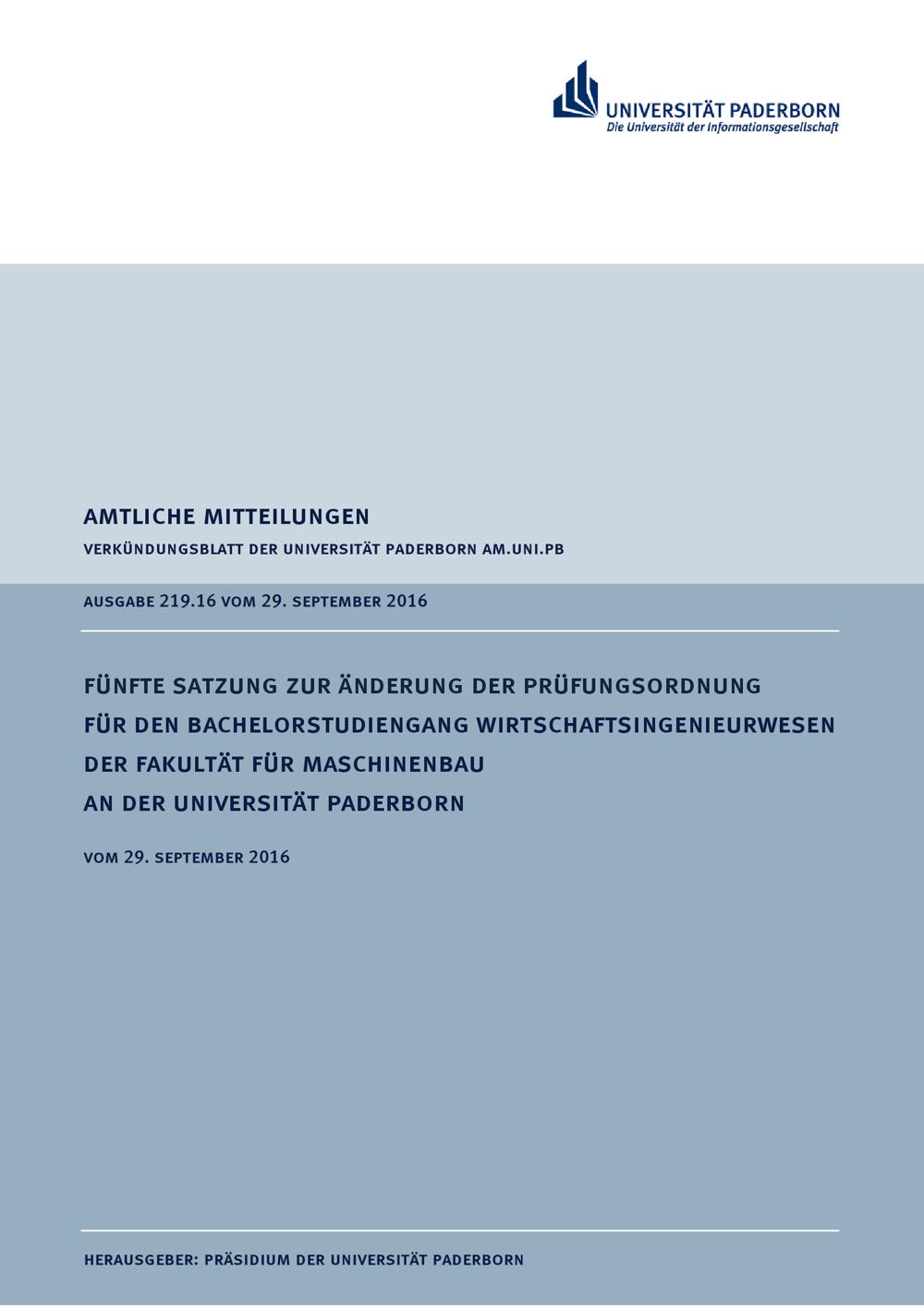 Fünfte Satzung zur Änderung der Prüfungsordnung für den Bachelorstudiengang Wirtschaftsingenieurwesen der Fakultät für Maschinenbau an der Universität Paderborn : vom 29. September 2016