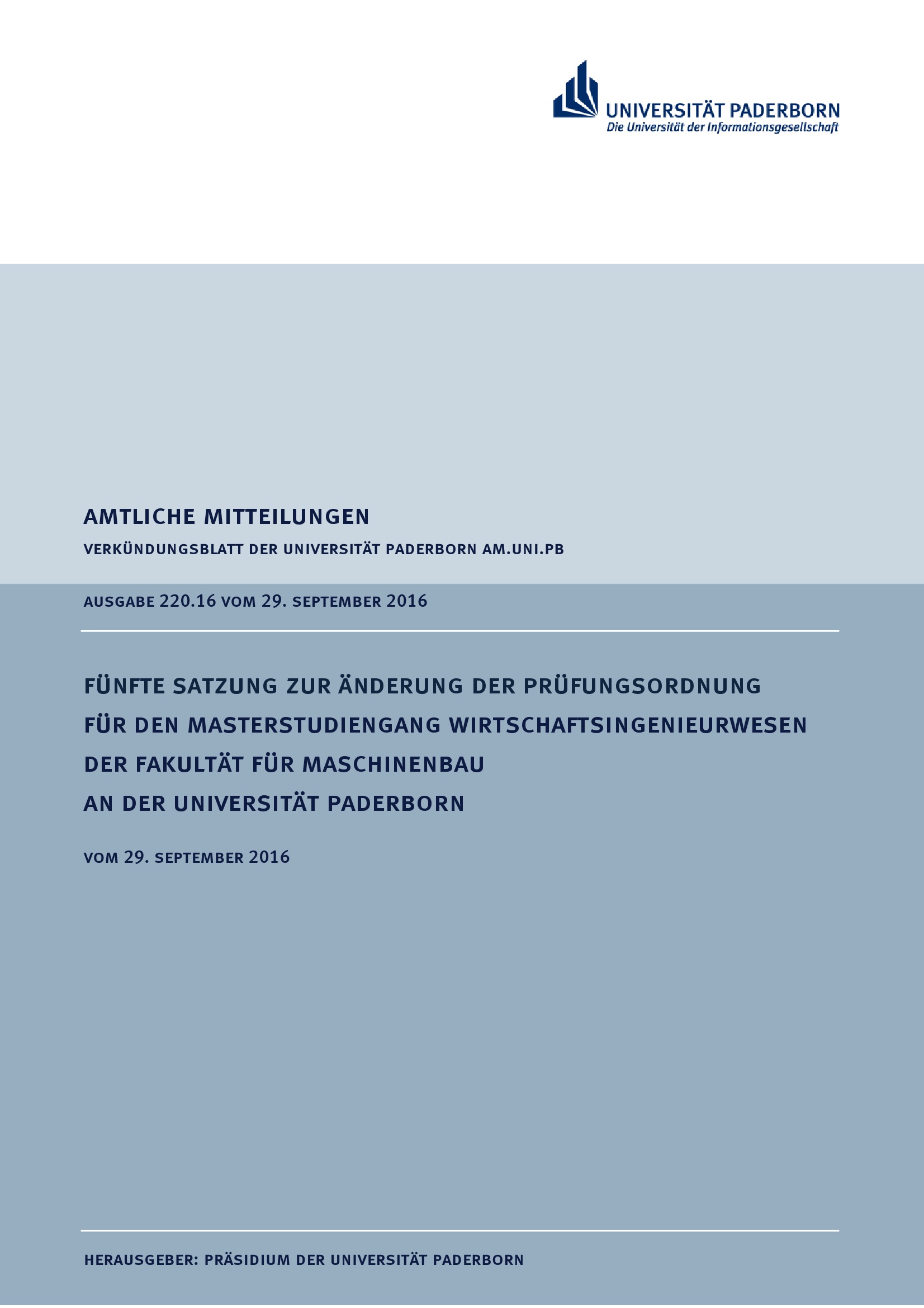 Fünfte Satzung zur Änderung der Prüfungsordnung für den Masterstudiengang Wirtschaftsingenieurwesen der Fakultät für Maschinenbau an der Universität Paderborn : vom 29. September 2016
