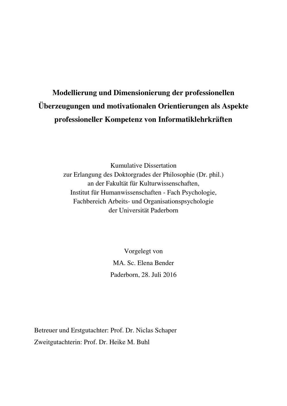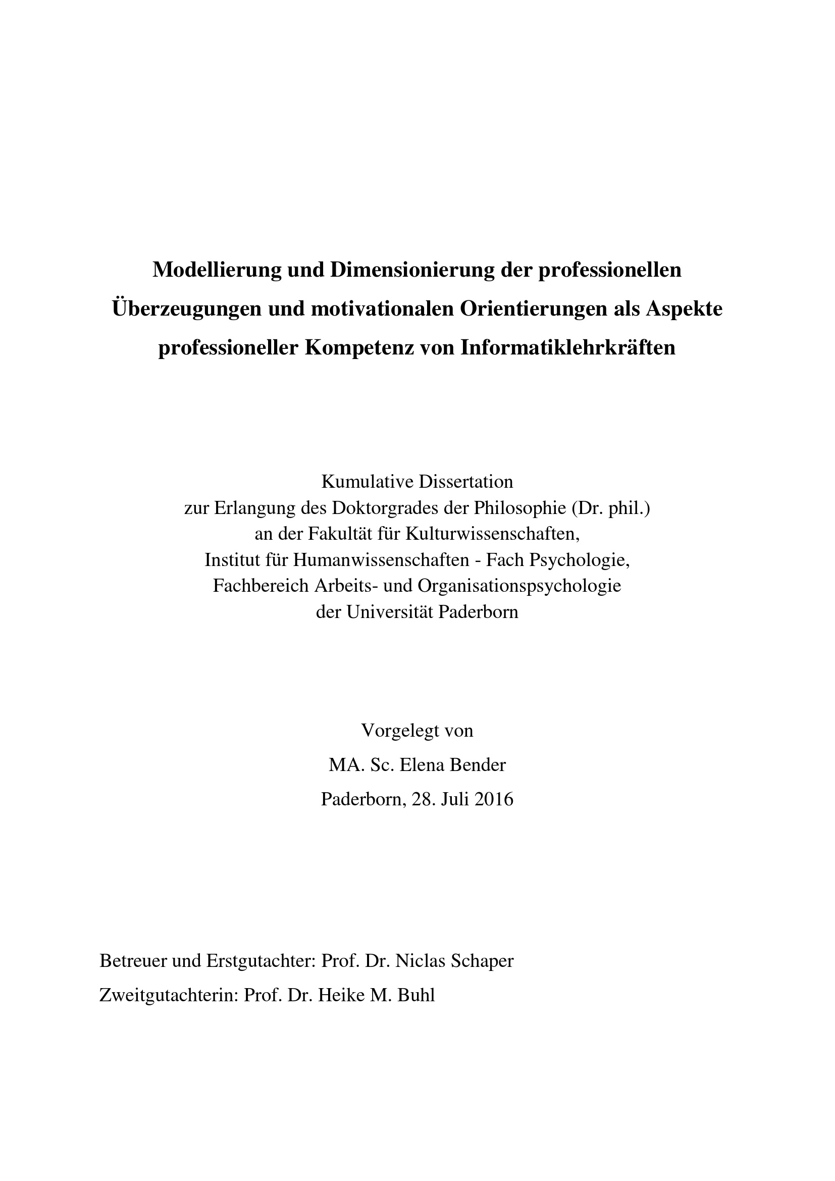 Modellierung und Dimensionierung der professionellen Überzeugungen und motivationalen Orientierungen als Aspekte professioneller Kompetenz von Informatiklehrkräften / vorgelegt von MA. Sc. Elena Bender. Betreuer und Erstgutachter: Prof. Dr. Niclas Schaper, Zweitgutachterin: Prof. Dr. Heike M. Buhl