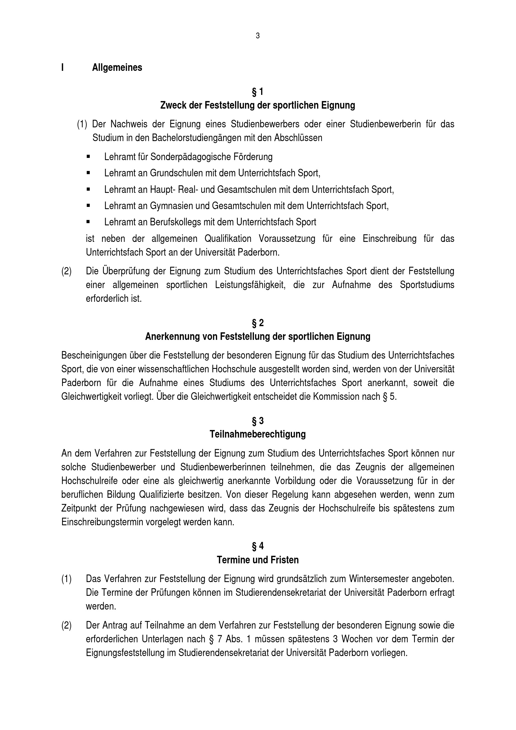 Ordnung zur Feststellung der besonderen studiengangsbezogenen fachlichen Eignung in den Bachelorstudiengängen Sport, Lehramt an Grundschulen mit dem Unterrichtsfach Sport, Lehramt an Haupt-, Real- und Gesamtschulen mit dem Unterrichtsfach Sport, Lehramt an Gymnasien und Gesamtschulen mit dem Unterrichtsfach Sport, Lehramt an Berufskollegs mit dem Unterrichtsfach Sport an der Universität Paderborn : vom 14. Oktober 2016