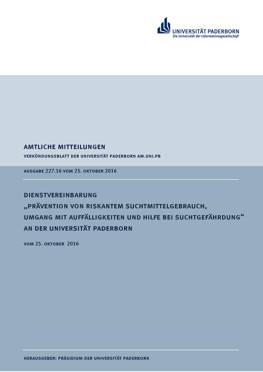 Dienstvereinbarung „Prävention von riskantem Suchtmittelgebrauch, Umgang mit Auffälligkeiten und Hilfe bei Suchtgefährdung“ an der Universität Paderborn : vom 25. Oktober 2016