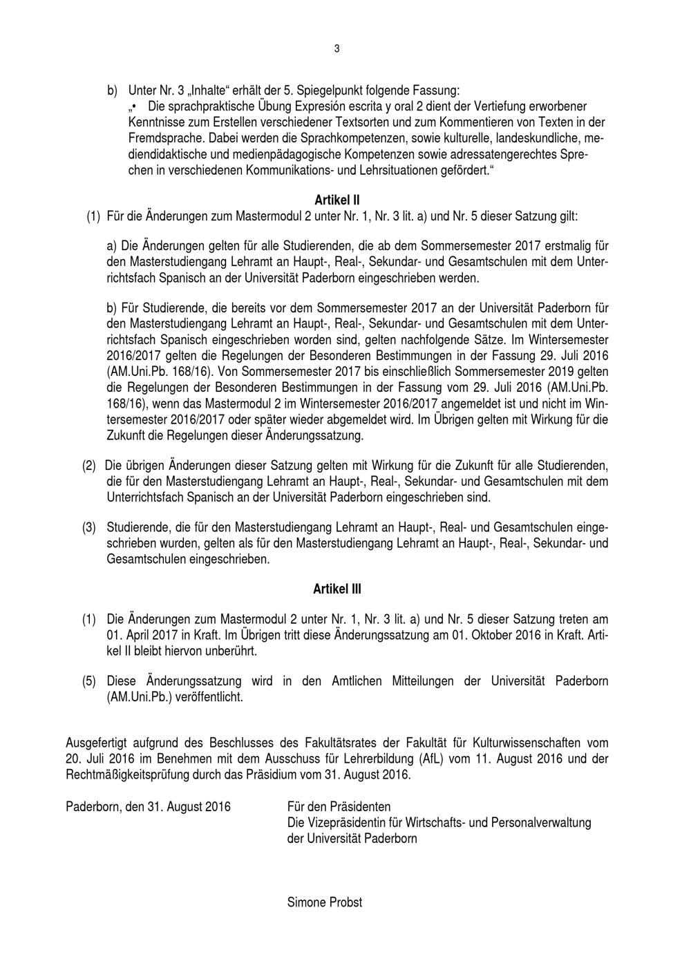 Satzung zur Änderung der Besonderen Bestimmungen der Prüfungsordnung für den Masterstudiengang Lehramt an Haupt-, Real-, Sekundar- und Gesamtschulen mit dem Unterrichtsfach Spanisch an der Universität Paderborn : vom 31. August 2016