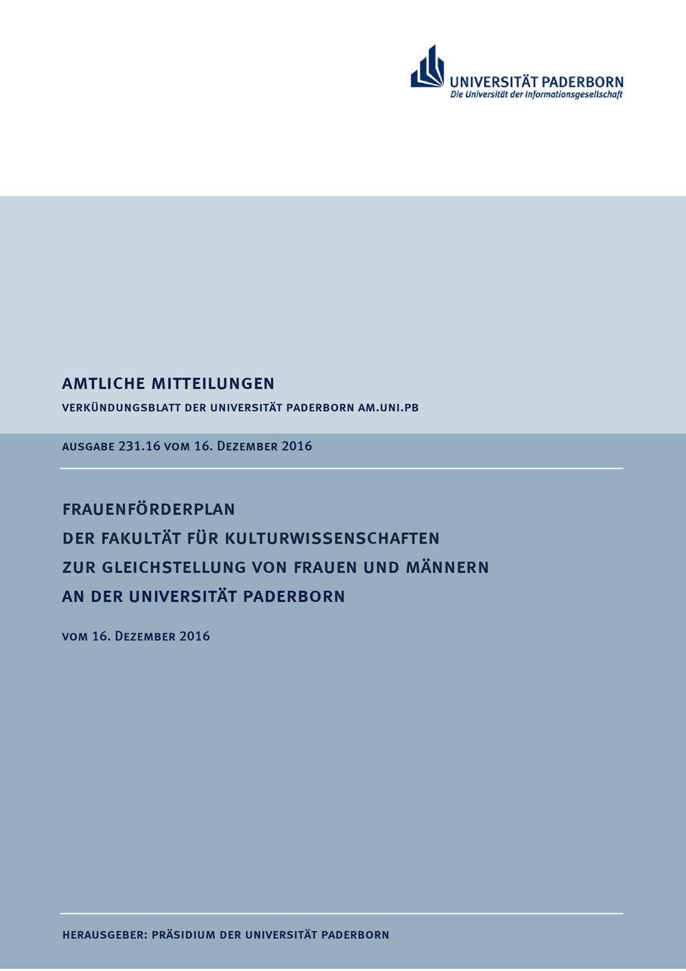 Frauenförderplan der Fakultät für Kulturwissenschaften zur Gleichstellung von Frauen und Männern an der Universität Paderborn : vom 16. Dezember 2016