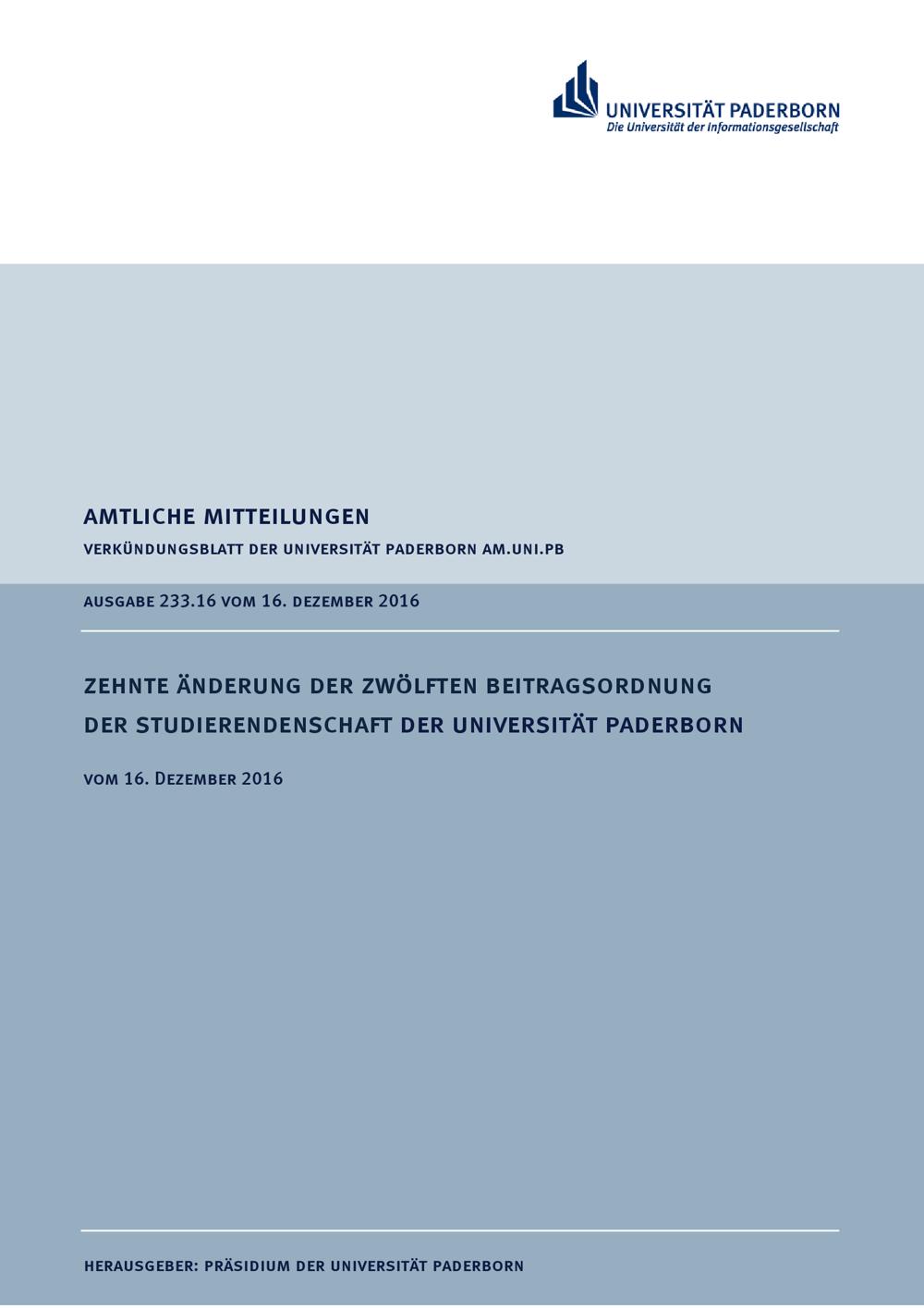 Zehnte Änderung der zwölften Beitragsordnung der Studierendenschaft der Universität Paderborn : vom 16. Dezember 2016