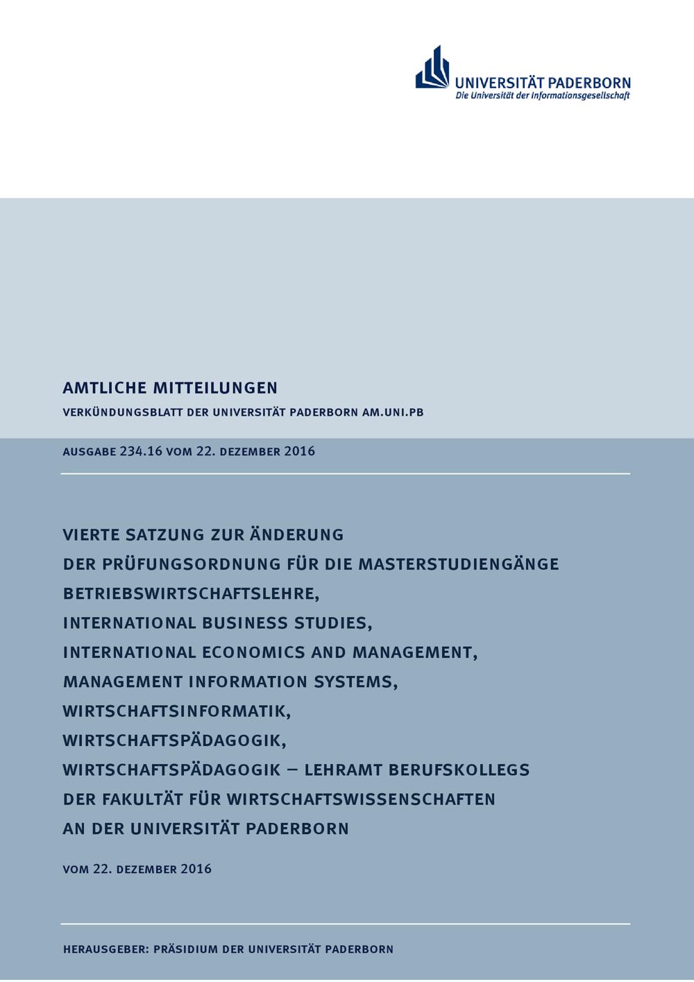 Vierte Satzung zur Änderung der Prüfungsordnung für die Masterstudiengänge Betriebswirtschaftslehre, International Business Studies, International Economics and Management, Management Information Systems, Wirtschaftsinformatik, Wirtschaftspädagogik, Wirtschaftspädagogik - Lehramt Berufskollegs der Fakultät für Wirtschaftswissenschaften an der Universität Paderborn : vom 22. Dezember 2016