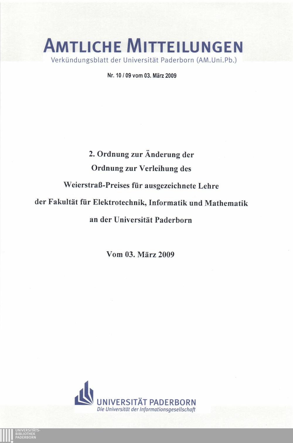 2. Ordnung zur Änderung der Ordnung zur Verleihung des Weierstraß-Preises für ausgezeichnete Lehre der Fakultät für Elektrotechnik, Informatik und Mathematik an der Universität Paderborn : vom 03. März 2009