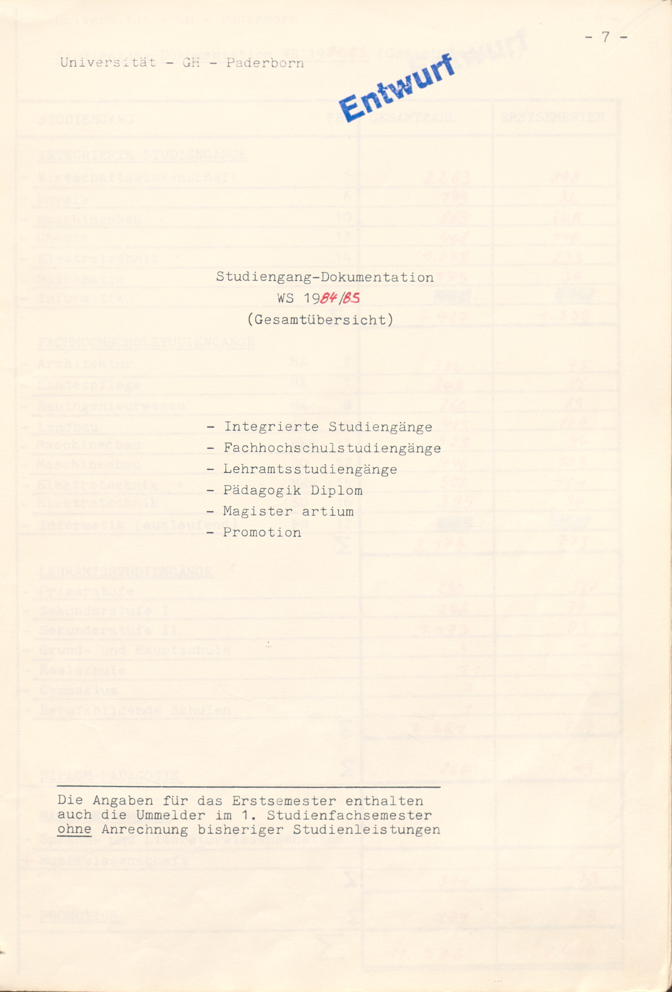 Studiengang-Dokumentation WS 1984/85 (Gesamtübersicht)