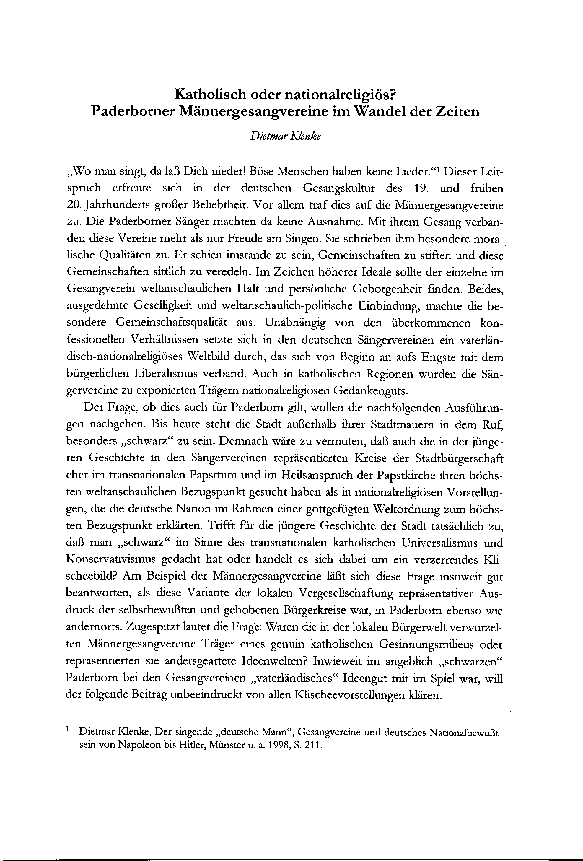 Dietmar Klenke, Katholisch oder nationalreligiös? Paderborner Männergesangvereine im Wandel der Zeiten