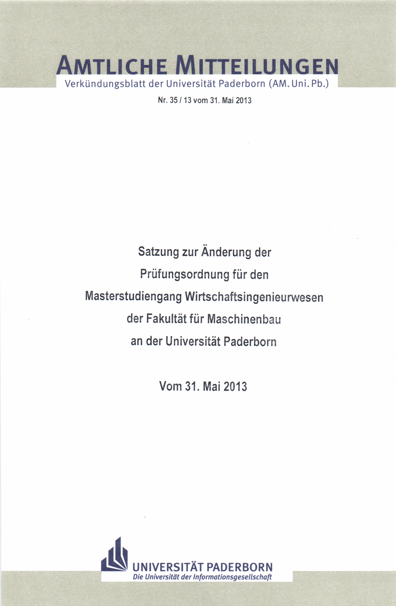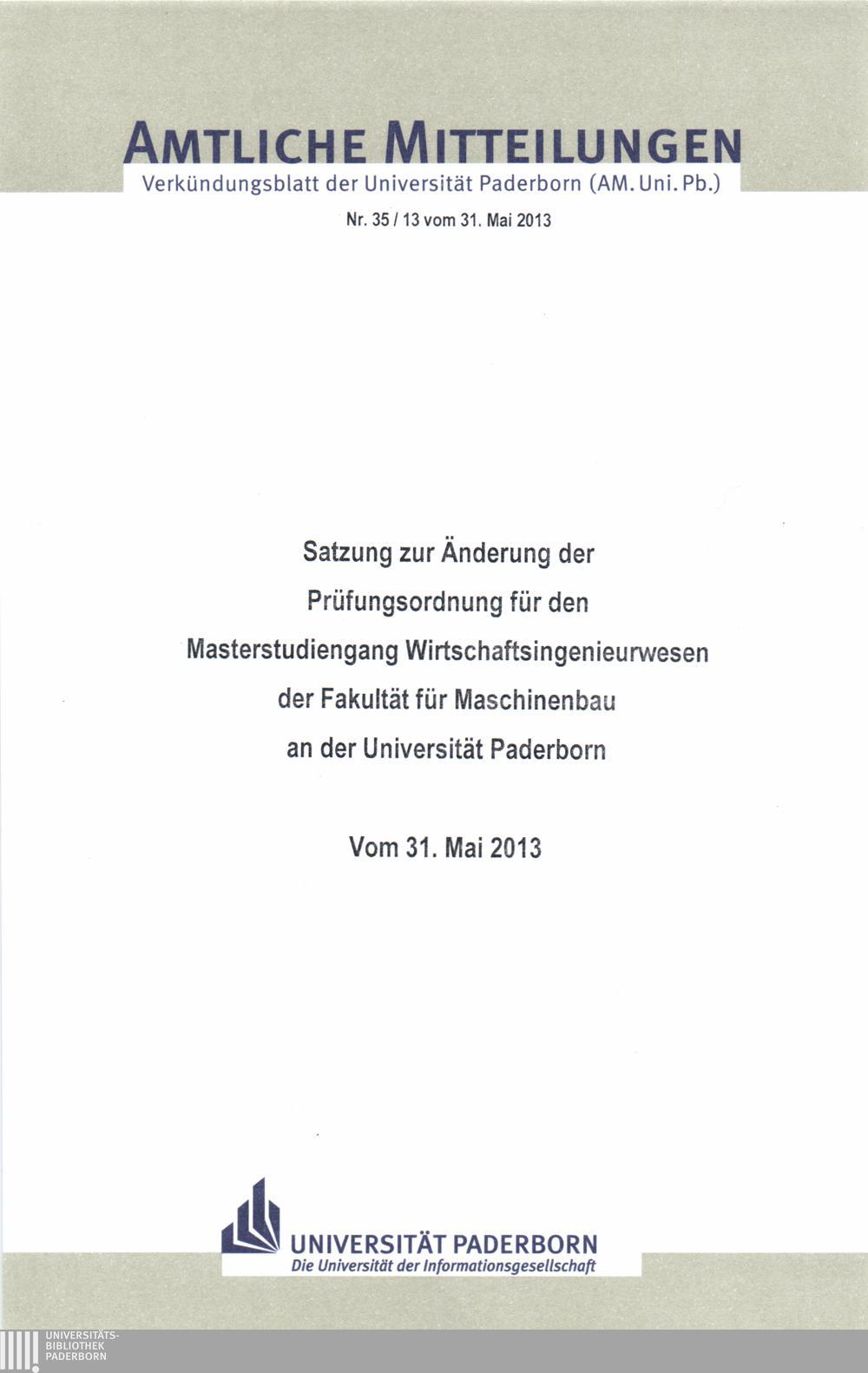Satzung zur Änderung der Prüfungsordnung für den Masterstudiengang Wirtschaftsingenieurwesen der Fakultät für Maschinenbau an der Universität Paderborn : vom 31. Mai 2013