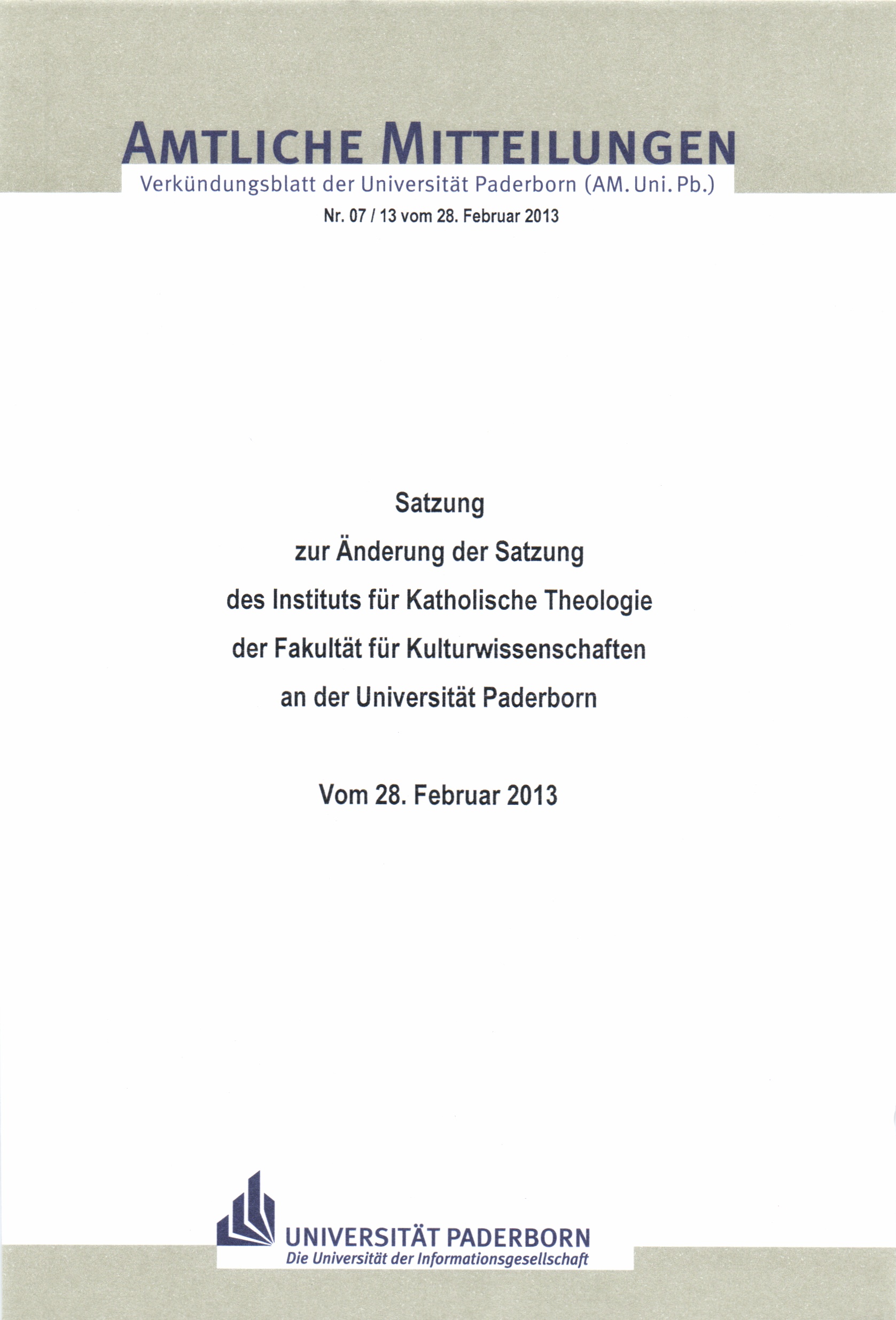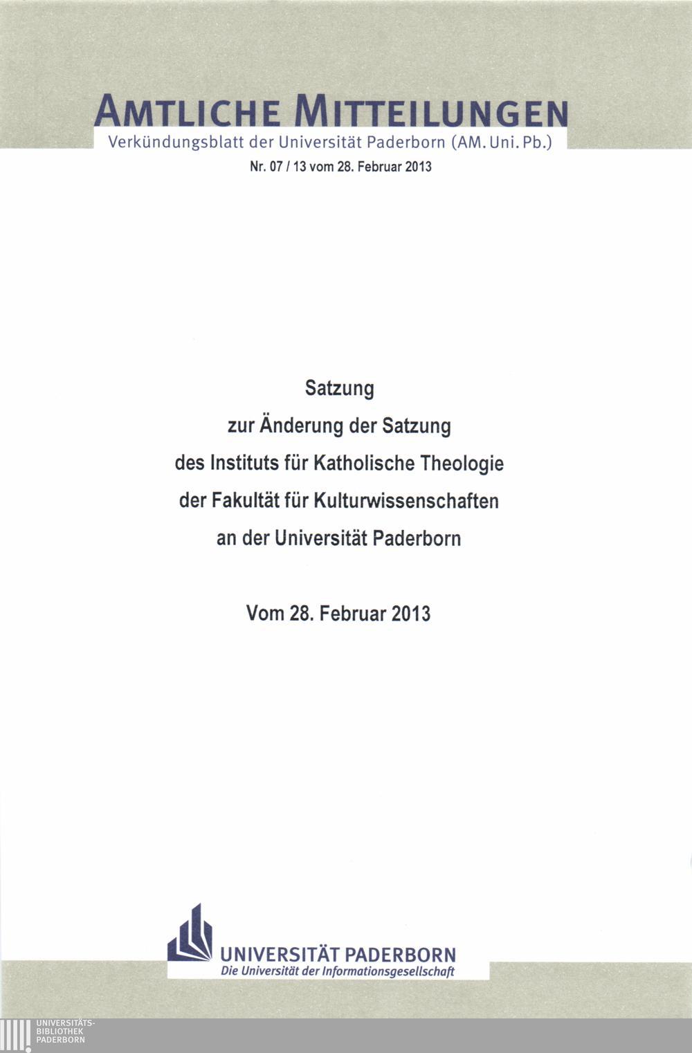 Satzung zur Änderung der Satzung des Instituts für Katholische Theologie der Fakultät für Kulturwissenschaften an der Universität Paderborn : vom 28. Februar 2013